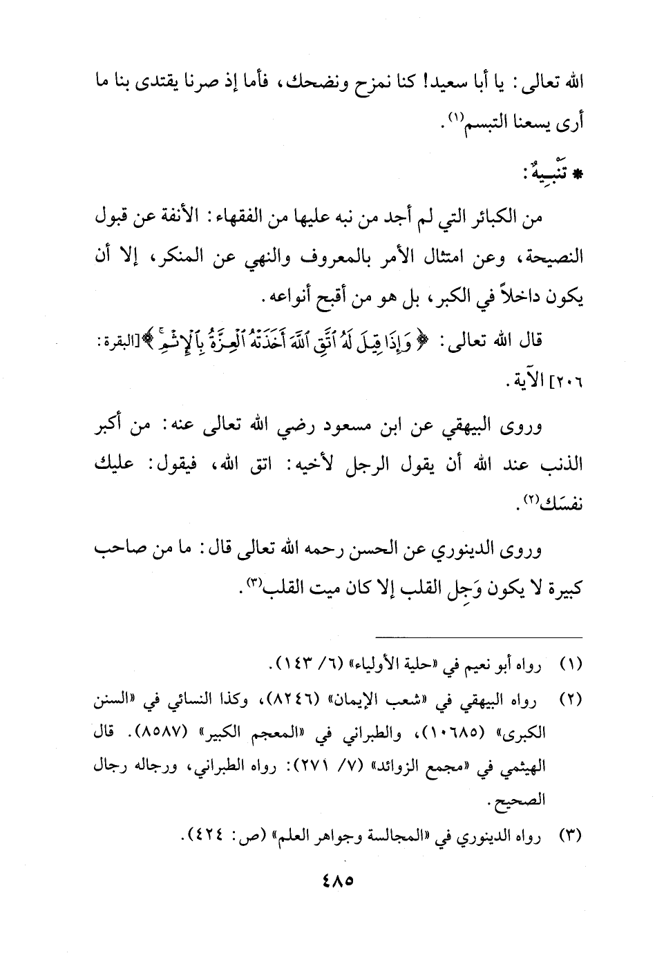 وروى البيهقي عن ابن مسعود رضي الله تعالى عثه: من أكبر الذنب عند الله أن يقول الرَّجل لأخيه: اتق الله، فيقول: عليك نفسَك (¬2).