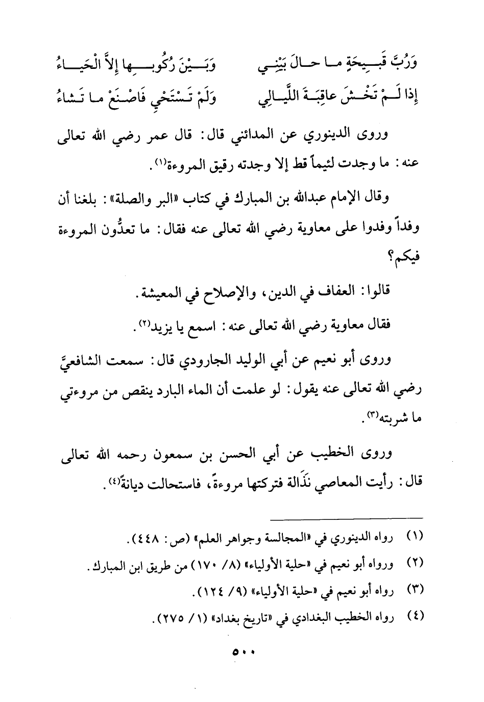 وقال الإمام عبد الله بن المبارك في كتاب "البرّ والصلة": بلغنا أن وفدًا وفدوا على معاوية رضي الله تعالى عنه فقال: ما تعدُّون المروءة فيكم؟