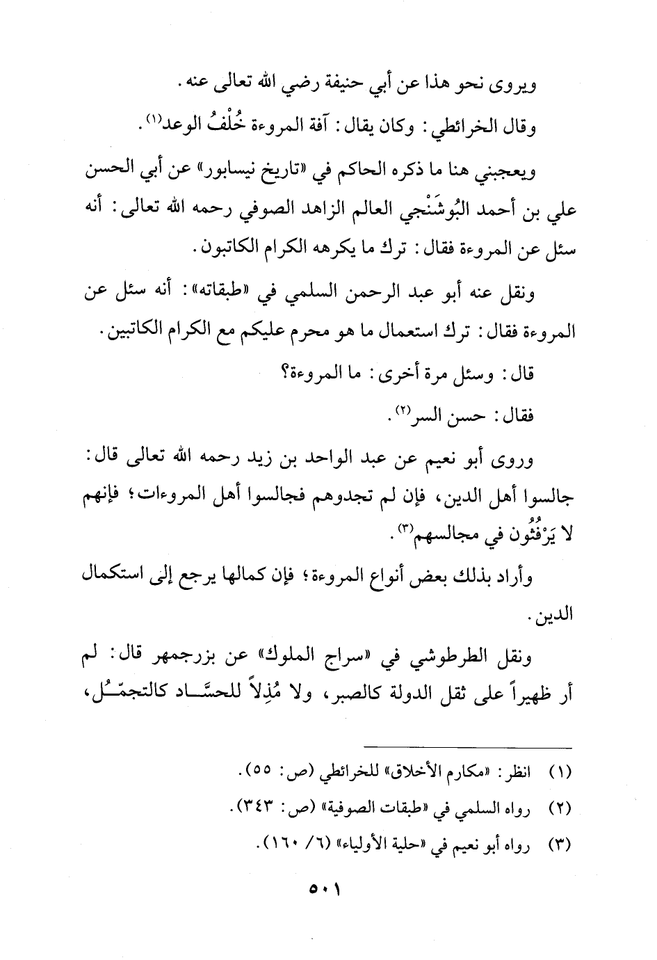 ونقل عنه أبو عبد الرّحمن السلمي في "طبقاته": أنّه سئل عن المروءة فقال: ترك استعمال ما هو محرم عليكم مع الكرام الكاتبين.