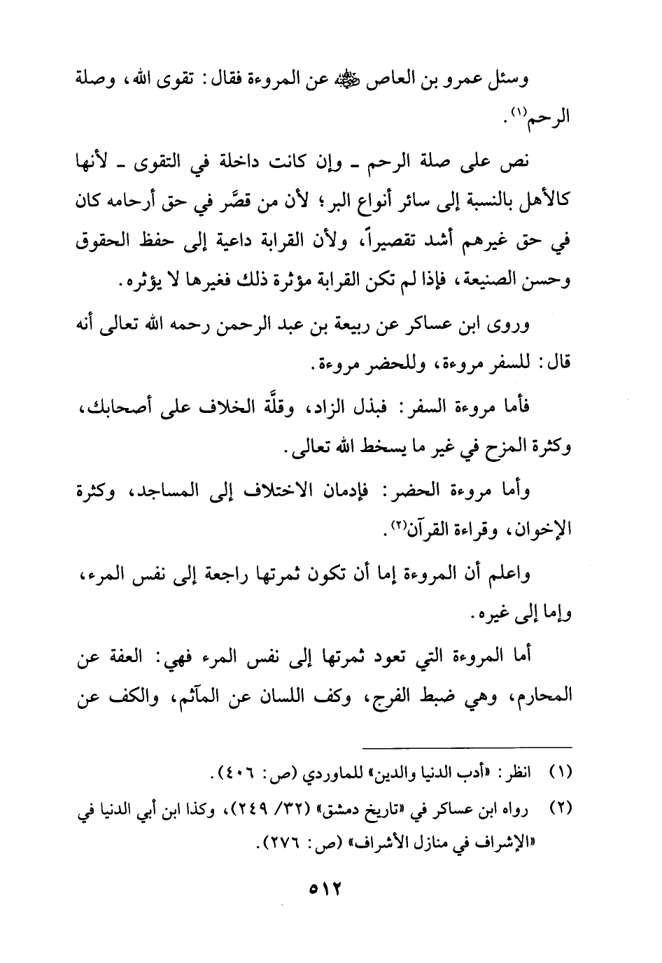 وسئل عمرو بن العاص - رضي الله عنه - عن المروءة فقال: تقوى الله، وصلة الرّحم (¬1).