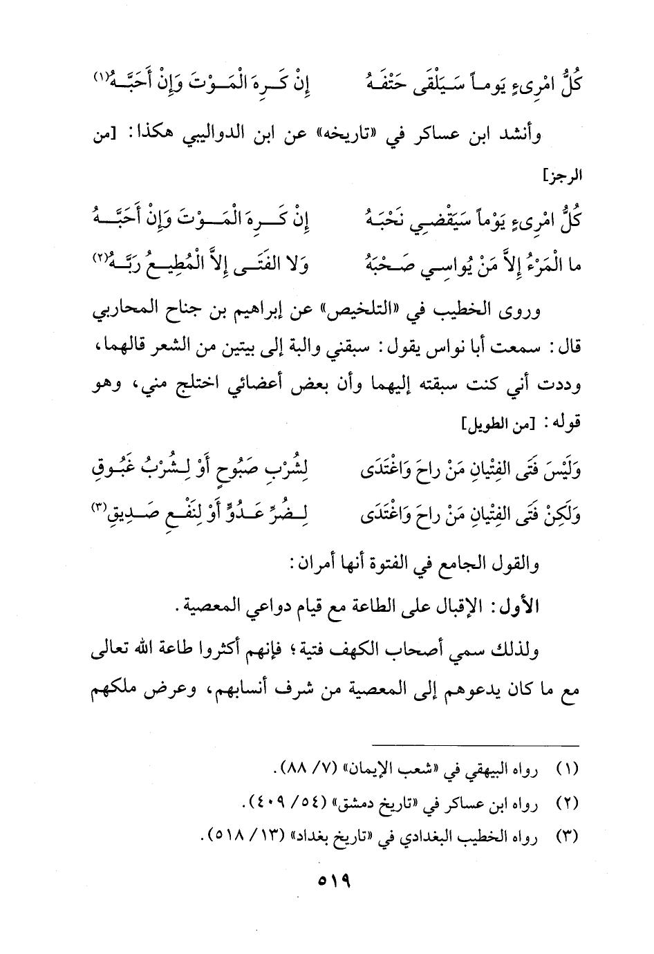ما الْمَرْءُ إِلاَّ مَنْ يُواسِي صَحْبَهُ ... وَلا الفَتَى إِلَّا الْمُطِيعُ رَبَّهُ (¬2)