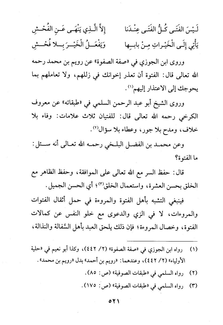 وروى الشّيخ أبو عبد الرّحمن السلمي في "طبقاته" عن معروف الكرخي رحمه الله تعالى قال: للفتيان ثلاث علامات: وفاء بلا خلاف، ومدح بلا جور، وعطاء بلا سؤال (¬2).