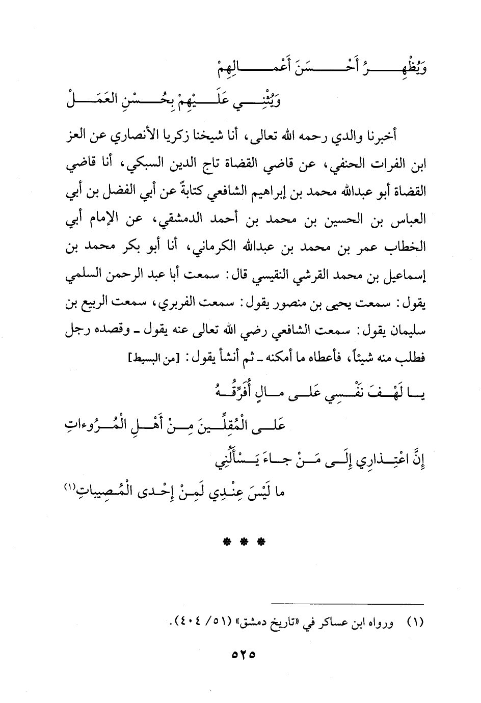 أخبرنا والدي رحمه الله تعالى، أنا شيخنا زكريا الأنصاري عن العز ابن الفرات الحنفي، عن قاضي القضاة تاج الدِّين السبكي، أنا قاضي القضاة أبو عبد الله محمّد بن إبراهيم الشّافعيّ كتابةً عن أبي الفضل بن أبي العباس بن الحسين بن محمّد بن أحمد الدمشقي، عن الإمام أبي الخطّاب عمر بن محمّد بن عبد الله الكرماني، أنا أبو بكر محمّد بن إسماعيل بن محمّد القرشي النقيسي قال: سمعت أبا عبد الرّحمن السلمي يقول: سمعت يحيى بن منصور يقول: سمعت الفربري، سمعت الربيع بن سليمان يقول: سمعت الشّافعيّ رضي الله تعالى عنه يقول - وقصده رجل فطلب منه شيئا، فأعطاه ما أمكنه - ثمّ أنشأ يقول: [من البسيط]