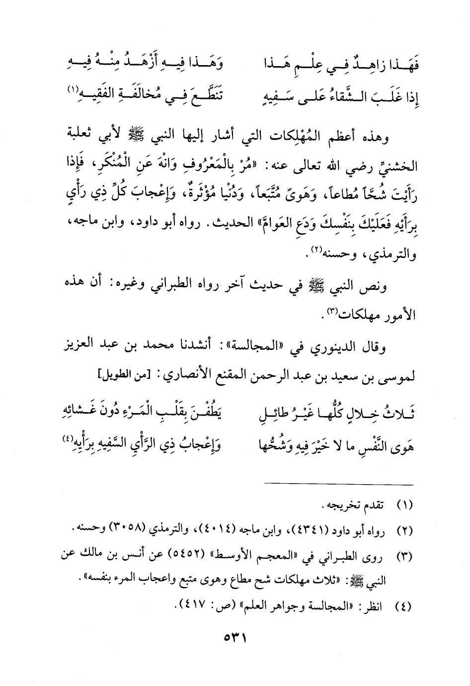 وهذه أعظم المُهْلِكات الّتي أشار إليها النّبيّ - صلى الله عليه وسلم - لأبي ثعلبة الخشنيِّ رضي الله تعالى عنه: "مُرْ بِالْمَعْرُوفِ وَانْهَ عَنِ الْمُنْكَرِ، فَإِذا رَأَيْتَ شُحًّا مُطاعًا، وَهَوىً مُتَّبَعًا، وَدُنْيا مُؤْثَرةٌ، وإِعْجابَ كُلِّ ذِي رَأْي بِرَأَيْهِ فَعَلَيْكَ بِنَفْسِكَ وَدعَ العَوامَّ" الحديث. رواه أبو داود، وابن ماجه، والترمذي، وحسنه (¬2).