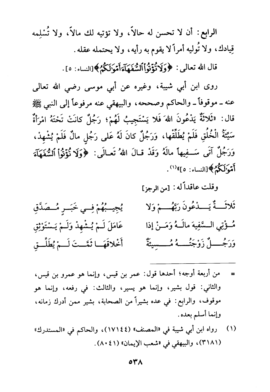 روى ابن أبي شيبة، وغيره عن أبي موسى رضي الله تعالى عنه - موقوفا - والحاكم وصححه، والبيهقي عنه مرفوعا إلى النّبيّ - صلى الله عليه وسلم - قال: "ثَلاثة يَدْعُونَ اللهَ فَلا يَسْتَجِيبُ لَهُمْ؛ رَجُلٌ كانَتْ تَحْتَهُ امْرَأة سَيِّئَةُ الْخُلُقِ فَلَمْ يُطَلِّقْها، وَرَجُل كانَ لَهُ عَلى رَجُلٍ مالٌ فَلَمْ يُشْهِدْ، وَرَجُلٌ آتَى سَفِيها مالَهُ وَقَدْ قالَ اللهُ تَعالَى: {وَلَا تُؤْتُوا السُّفَهَاءَ أَمْوَالَكُمُ} [النساء: 5] " (¬1).وقلت عاقدًا له: [من الرجز]