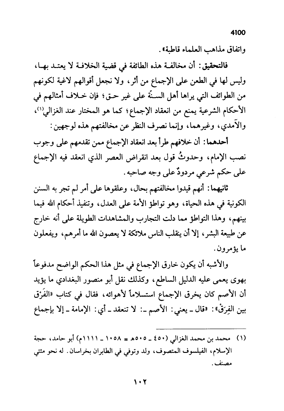 فالتحقيق: أن مخالفة هذه الطائفة في قضية الخلافة لا يعتد بها، وليس لها في الطعن على الإجماع من أثر، ولا نجعل أقوالهم لاغية لكونهم من الطوائف التي يراها أهل السنّة على غير حق؛ فإن خلاف أمثالهم في الأحكام الشرعية يمنع من انعقاد الإجماع؛ كما هو المختار عند الغزالي (¬1)، والآمدي، وغيرهما، وإنما نصرف النظر عن مخالفتهم هذه لوجهين: