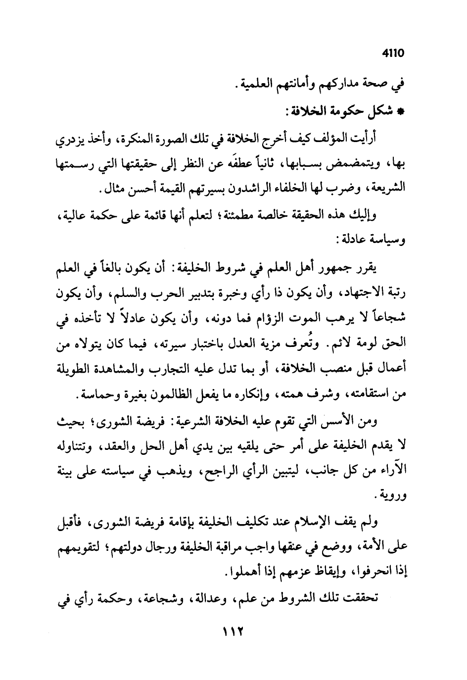 يقرر جمهور أهل العلم في شروط الخليفة: أن يكون بالغاً في العلم رتبة الاجتهاد، وأن يكون ذا رأي وخبرة بتدبير الحرب والسلم، وأن يكون شجاعاً لا يرهب الموت الزؤام فما دونه، وأن يكون عادلاً لا تأخذه في الحق لومة لائم. وتُعرف مزية العدل باختبار سيرته، فيما كان يتولاه من أعمال قبل منصب الخلافة، أو بما تدل عليه التجارب والمشاهدة الطويلة من استقامته، وشرف همته، وإنكاره ما يفعل الظالمون بغيرة وحماسة.
