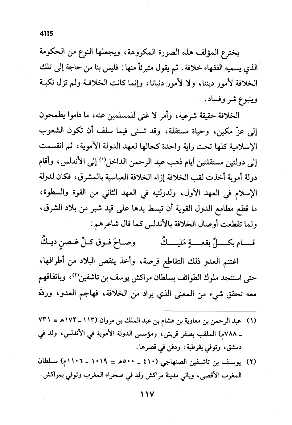 يخترع المؤلف هذه الصورة المكروهة، ويجعلها النوع من الحكومة الذي يسميه الفقهاء خلافة. ثم يقول متبرئاً منها: فليس بنا من حاجة إلى تلك الخلافة لأمور ديننا، ولا لأمور دنيانا، وإنما كانت الخلافة ولم تزل نكبة وينبوع شر وفساد.