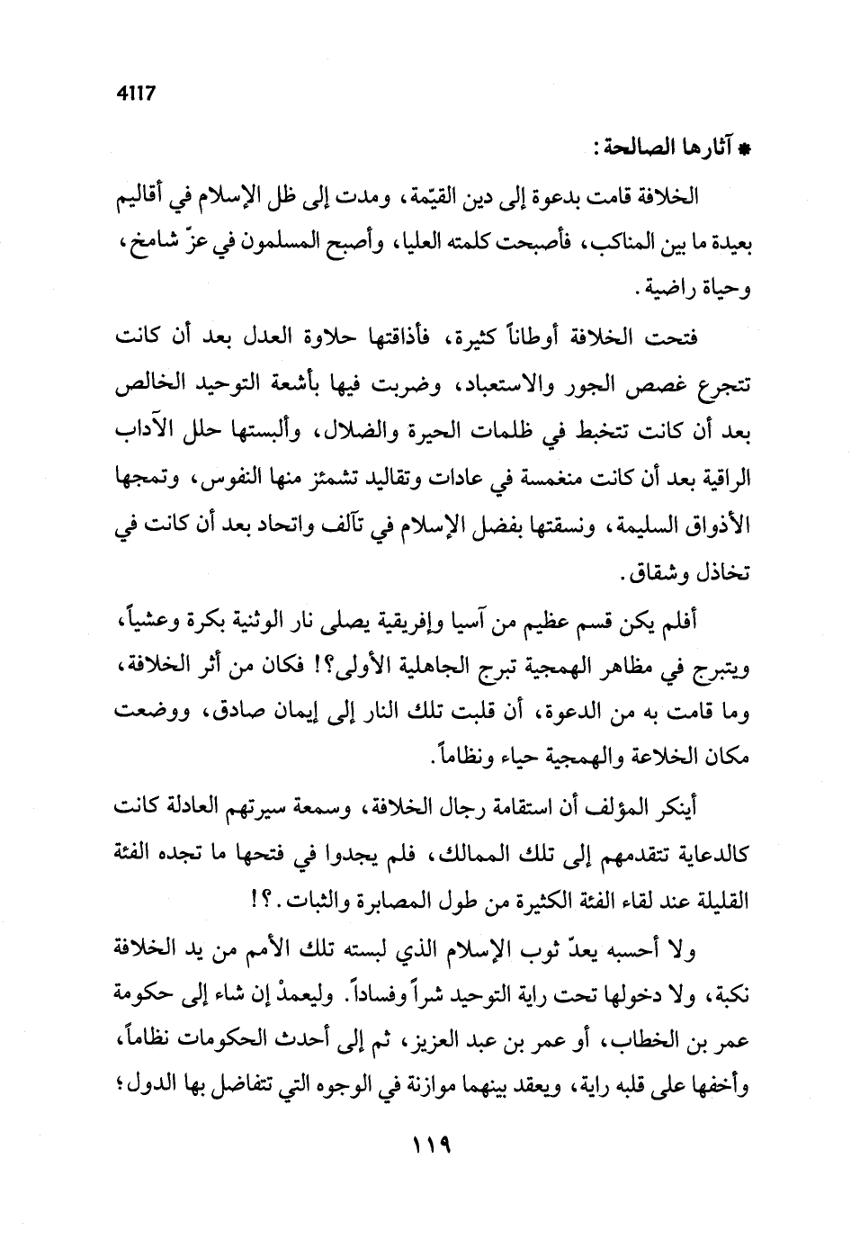 الخلافة قامت بدعوة إلى دين القيّمة، ومدت إلى ظل الإسلام في أقاليم بعيدة ما بين المناكب، فأصبحت كلمته العليا، وأصبح المسلمون في عزّ شامخ، وحياة راضية.