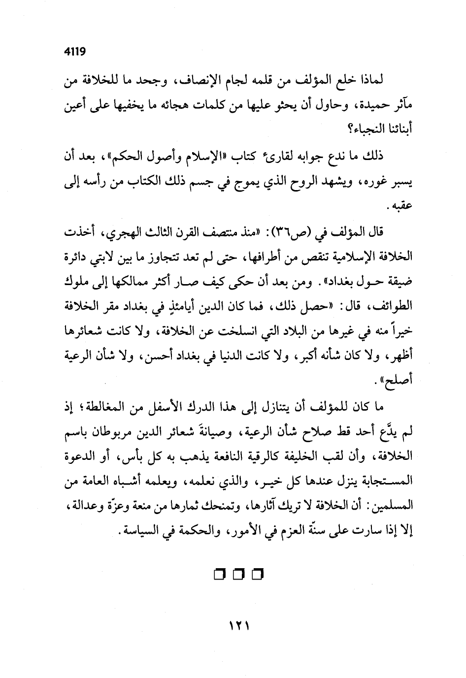 ما كان للمؤلف أن يتنازل إلى هذا الدرك الأسفل من المغالطة؛ إذ لم يدَّع أحد قط صلاح شأن الرعية، وصيانةَ شعائر الدين مربوطان باسم الخلافة، وأن لقب الخليفة كالرقية النافعة يذهب به كل بأس، أو الدعوة المستجابة ينزل عندها كل خير، والذي نعلمه، ويعلمه أشباه العامة من المسلمين: أن الخلافة لا تريك آثارها، وتمنحك ثمارها من منعة وعزّة وعدالة، إلا إذا سارت على سنّة العزم في الأمور، والحكمة في السياسة.