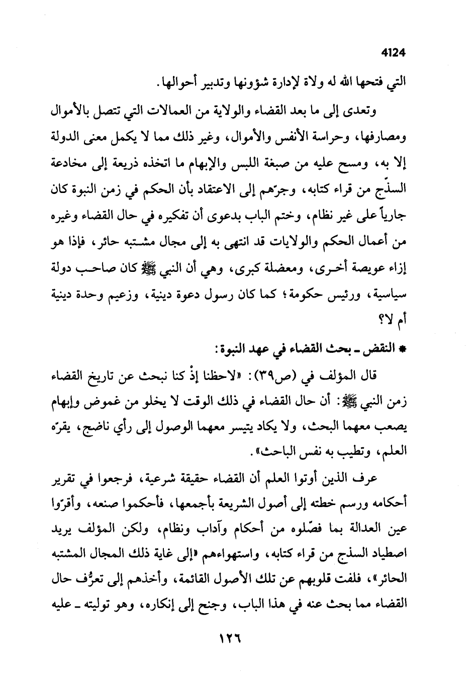 وتعدى إلى ما بعد القضاء والولاية من العمالات التي تتصل بالأموال ومصارفها، وحراسة الأنفس والأموال، وغير ذلك مما لا يكمل معنى الدولة إلا به، ومسح عليه من صبغة اللبس والإبهام ما اتخذه ذريعة إلى مخادعة السذّج من قراء كتابه، وجرّهم إلى الاعتقاد بأن الحكم في زمن النبوة كان جارياً على غير نظام، وختم الباب بدعوى أن تفكيره في حال القضاء وغيره من أعمال الحكم والولايات قد انتهى به إلى مجال مشتبه حائر، فإذا هو إزاء عويصة أخرى، ومعضلة كبرى، وهي أن النبي - صلى الله عليه وسلم - كان صاحب دولة سياسية، ورئيس حكومة؛ كما كان رسول دعوة دينية، وزعيم وحدة دينية أم لا؟