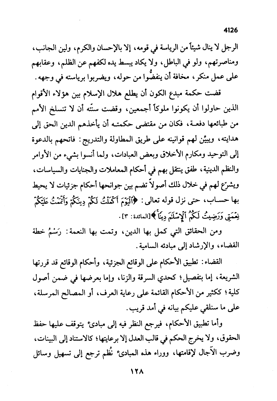 قضت حكمة مبدع الكون أن يطلع هلال الإسلام بين هؤلاء الأقوام الذين حاولوا أن يكونوا ملوكاً أجمعين، وقضت سنّته أن لا تنسلخ الأمم من طبائعها دفعة، فكان من مقتضى حكمته أن يأخذهم الدين الحق إلى هدايته، ويبيِّن لهم قوانينه على طريق المطاولة والتدريج: فاتحهم بالدعوة إلى التوحيد ومكارم الأخلاق وبعض العبادات، ولما أنسوا بشيء من الأوامر والنظم الدينية، طفق ينتقل بهم في أحكام المعاملات والجنايات والسياسات، ويشرّع لهم في خلال ذلك أصولاً تضم بين جوانحها أحكام جزئيات لا يحيط بها حساب، حتى نزل قوله تعالى: {الْيَوْمَ أَكْمَلْتُ لَكُمْ دِينَكُمْ وَأَتْمَمْتُ عَلَيْكُمْ نِعْمَتِي وَرَضِيتُ لَكُمُ الْإِسْلَامَ دِينًا} [المائدة: 3].