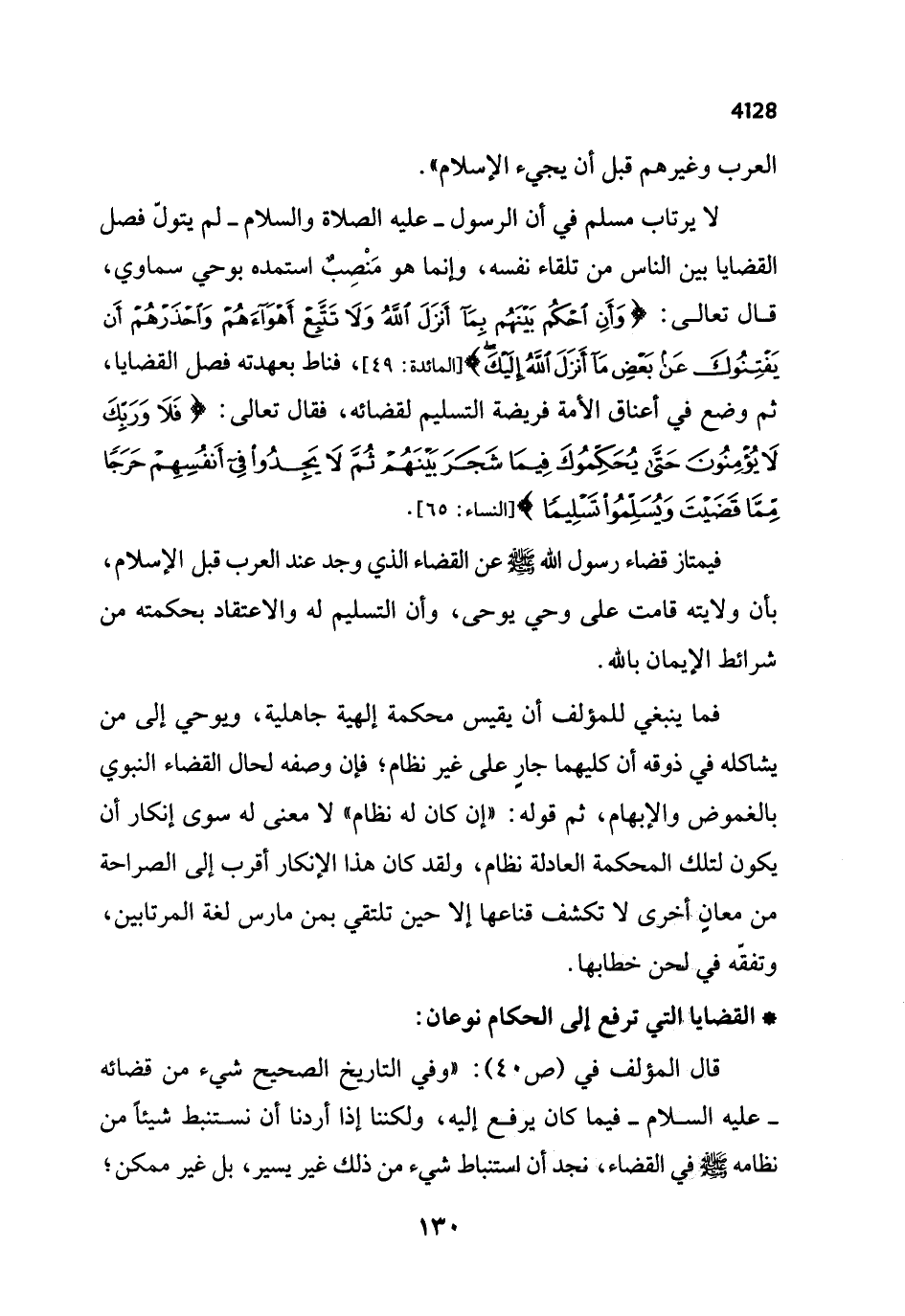 قال المؤلف في (ص 40): "وفي التاريخ الصحيح شيء من قضائه - عليه السلام - فيما كان يرفع إليه، ولكننا إذا أردنا أن نستنبط شيئاً من نظامه - صلى الله عليه وسلم - في القضاء، نجد أن استنباط شيء من ذلك غير يسير، بل غير ممكن؛