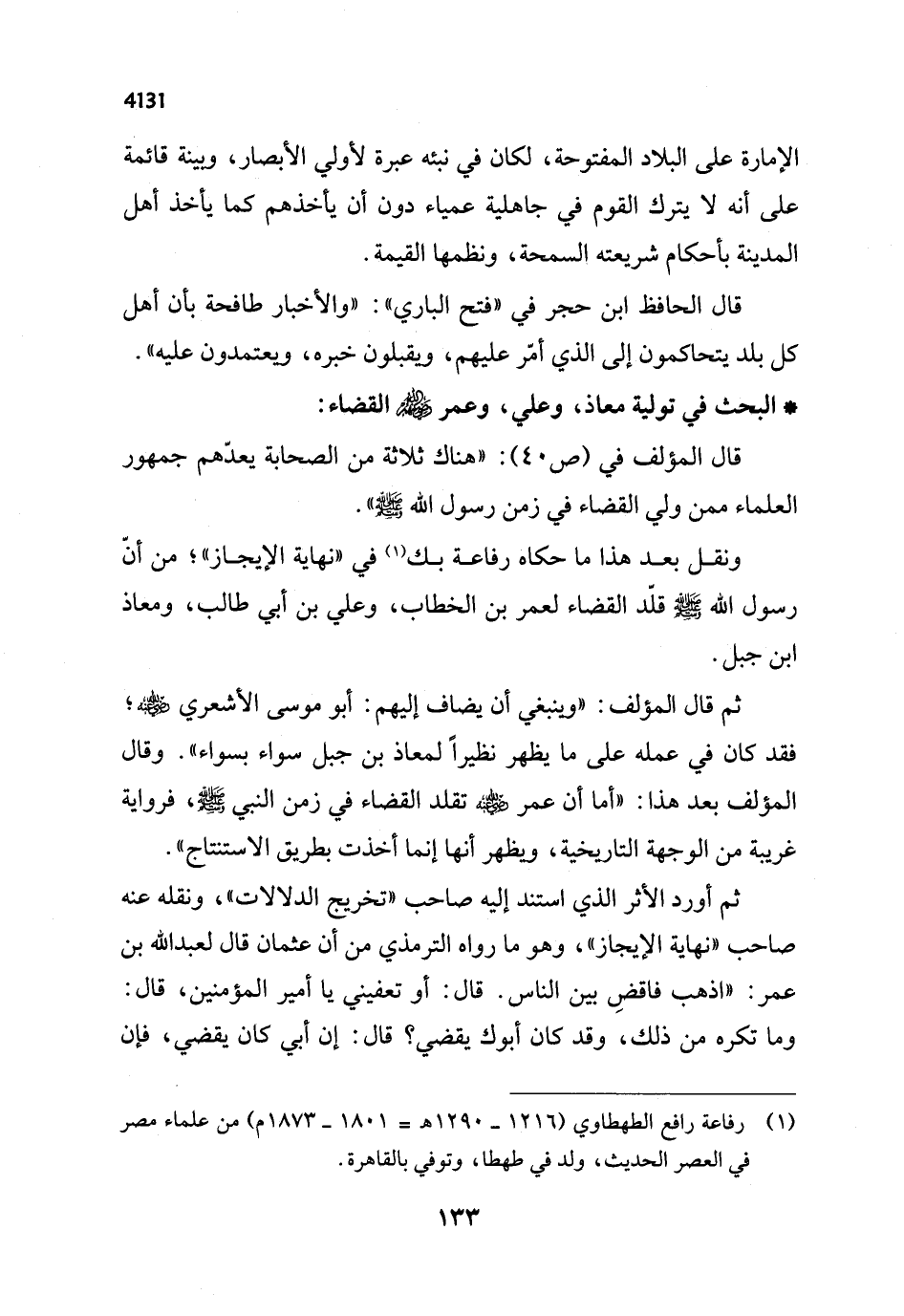 ونقل بعد هذا ما حكاه رفاعة بك (¬1) في "نهاية الإيجاز"؛ من أنّ رسول الله - صلى الله عليه وسلم - قلّد القضاء لعمر بن الخطاب، وعلي بن أبي طالب، ومعاذ ابن جبل.