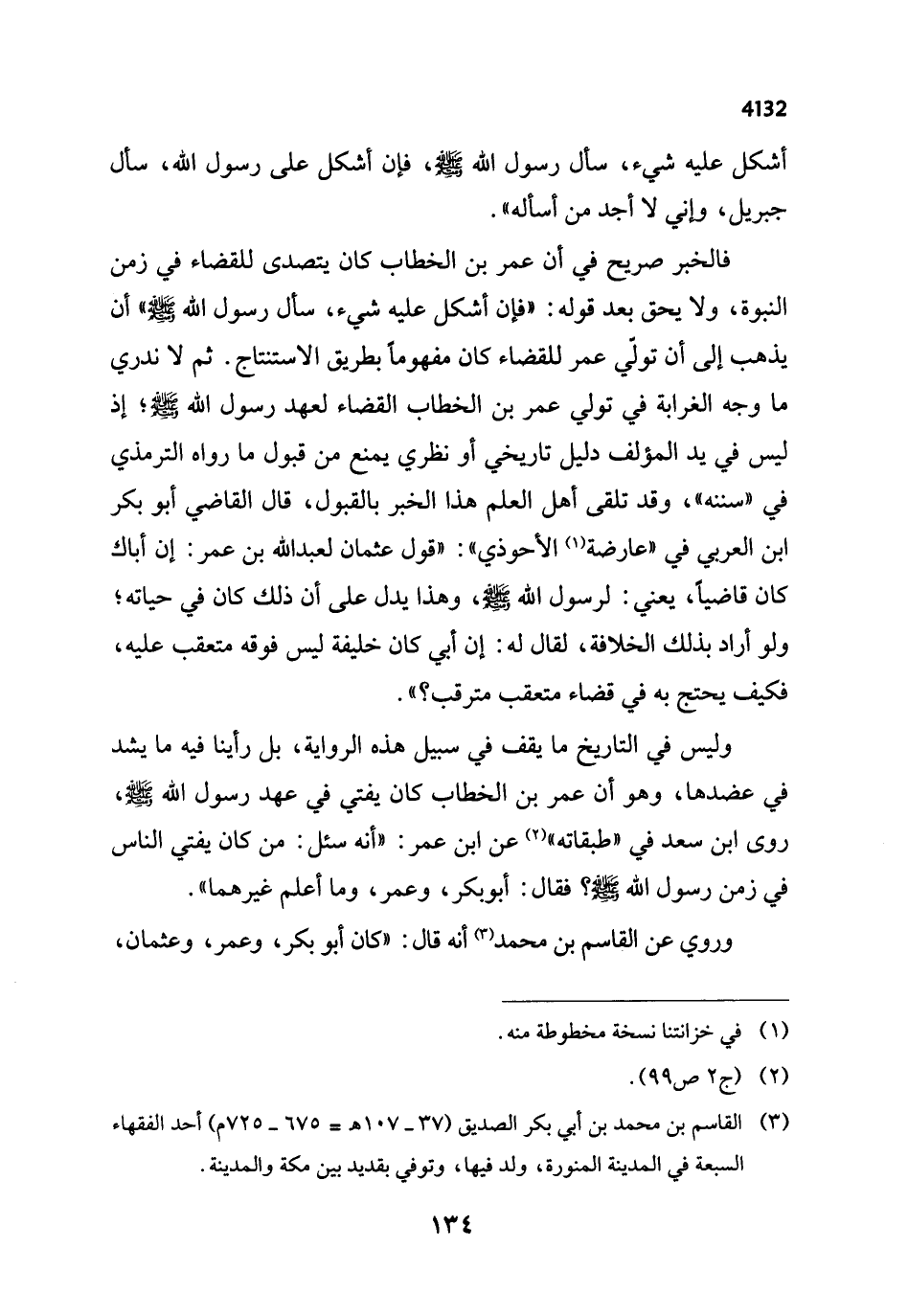 فالخبر صريح في أن عمر بن الخطاب كان يتصدى للقضاء في زمن النبوة، ولا يحق بعد قوله: "فإن أشكل عليه شيء، سأل رسول الله - صلى الله عليه وسلم - " أن يذهب إلى أن تولّي عمر للقضاء كان مفهوماً بطريق الاستنتاج. ثم لا ندري ما وجه الغرابة في تولي عمر بن الخطاب القضاء لعهد رسول الله - صلى الله عليه وسلم -؛ إذ ليس في يد المؤلف دليل تاريخي أو نظري يمنع من قبول ما رواه الترمذي في "سننه"، وقد تلقى أهل العلم هذا الخبر بالقبول، قال القاضي أَبو بكر ابن العربي في "عارضة (¬1) الأحوذي": "قول عثمان لعبد الله بن عمر: إن أباك كان قاضياً، يعني: لرسول الله - صلى الله عليه وسلم -، وهذا يدل على أن ذلك كان في حياته؛ ولو أراد بذلك الخلافة، لقال له: إن أبي كان خليفة ليس فوقه متعقب عليه، فكيف يحتج به في قضاء متعقب مترقب؟ ".