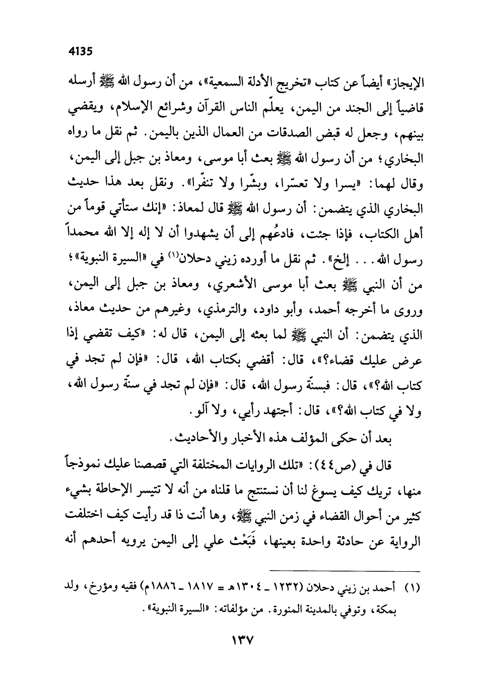 الإيجاز" أيضاً عن كتاب "تخريج الأدلة السمعية"، من أن رسول الله - صلى الله عليه وسلم - أرسله قاضياً إلى الجند من اليمن، يعلّم الناس القرآن وشرائع الإسلام، ويقضي بينهم، وجعل له قبض الصدقات من العمال الذين باليمن. ثم نقل ما رواه البخاري؛ من أن رسول الله - صلى الله عليه وسلم - بعث أبا موسى، ومعاذ بن جبل إلى اليمن، وقال لهما: "يسرا ولا تعسّرا، وبشّرا ولا تنفّرا". ونقل بعد هذا حديث البخاري الذي يتضمن: أن رسول الله - صلى الله عليه وسلم - قال لمعاذ: " إنك ستأتي قوماً من أهل الكتاب، فإذا جئت، فادعُهم إلى أن يشهدوا أن لا إله إلا الله محمداً رسول الله ... إلخ". ثم نقل ما أورده زيني دحلان (¬1) في "السيرة النبوية"؛ من أن النبي - صلى الله عليه وسلم - بعث أبا موسى الأشعري، ومعاذ بن جبل إلى اليمن، وروى ما أخرجه أحمد، وأبو داود، والترمذي، وغيرهم من حديث معاذ، الذي يتضمن: أن النبي - صلى الله عليه وسلم - لما بعثه إلى اليمن، قال له: "كيف تقضي إذا عرض عليك قضاء؟ "، قال: أقضي بكتاب الله، قال: "فإن لم تجد في كتاب الله؟ "، قال؛ فبسنّة رسول الله، قال: "فإن لم تجد في سنّة رسول الله، ولا في كتاب الله؟ "، قال: أجتهد رأيي، ولا آلو.