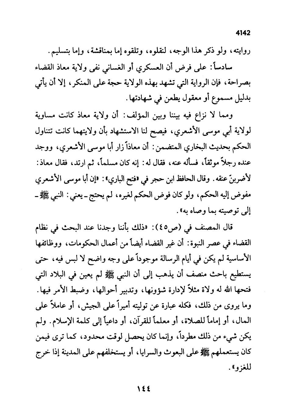 ومما لا نزاع فيه بيننا وبين المؤلف: أن ولاية معاذ كانت مساوية لولاية أبي موسى الأشعري، فيصح لنا الاستشهاد بأن ولايتهما كانت تتناول الحكم بحديث البخاري المتضمن: أن معاذاً زار أبا موسى الأشعري، ووجد عنده رجلاً موثقاً، فسأله عنه، فقال له: إنه كان مسلماً، ثم ارتد، فقال معاذ: لأضربنّ عنقه. وقال الحافظ ابن حجر في "فتح الباري": "إن أبا موسى الأشعري مفوض إليه الحكم، ولو كان فوض الحكم لغيره، لم يحتج -يعني: النبي - صلى الله عليه وسلم - إلى توصيته بما وصاه به".