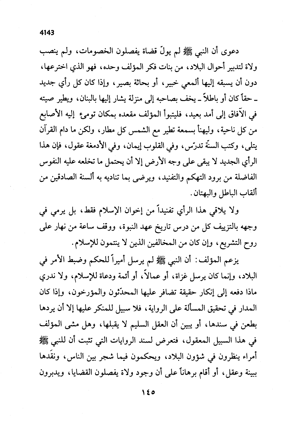 دعوى أن النبي - صلى الله عليه وسلم - لم يولّ قضاة يفصلون الخصومات، ولم ينصب ولاة لتدبير أحوال البلاد، من بنات فكر المؤلف وحده، فهو الذي اخترعها، دون أن يسبقه إليها ألمعي خبير، أو بحاثة بصير، وإذا كان كل رأي جديد -حقاً كان أو باطلاً- يخف بصاحبه إلى منزلة يشار إليها بالبنان، ويطير صيته في الآفاق إلى أمد بعيد، فليتبوأ المؤلف مقعده بمكان تومئ إليه الأصابع من كل ناحية، وليهنأ بسمعة تطير مع الشمس كل مطار، ولكن ما دام القرآن يتلى، وكتب السنّة تدرّس، وفي القلوب إيمان، وفي الأدمغة عقول، فإن هذا الرأي الجديد لا يبقى على وجه الأرض إلا أن يحتمل ما تخلعه عليه النفوس الفاضلة من برود التهكم والتفنيد، ويرضى بما تناديه به ألسنة الصادقين من ألقاب الباطل والبهتان.
