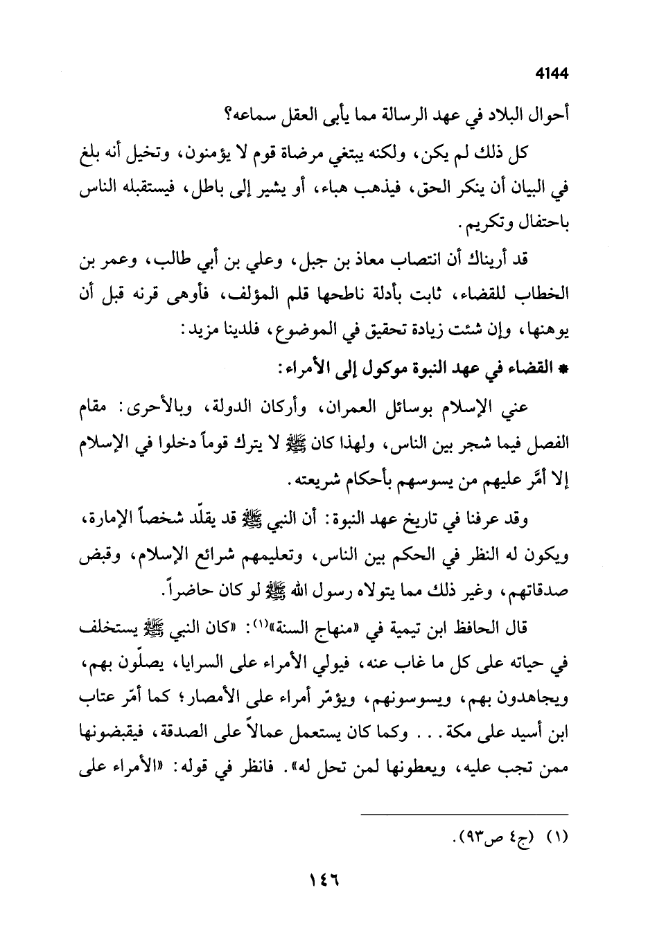 وقد عرفنا في تاريخ عهد النبوة: أن النبي - صلى الله عليه وسلم - قد يقلّد شخصاً الإمارة، ويكون له النظر في الحكم بين الناس، وتعليمهم شرائع الإسلام، وقبض صدقاتهم، وغير ذلك مما يتولاه رسول الله - صلى الله عليه وسلم - لو كان حاضراً.