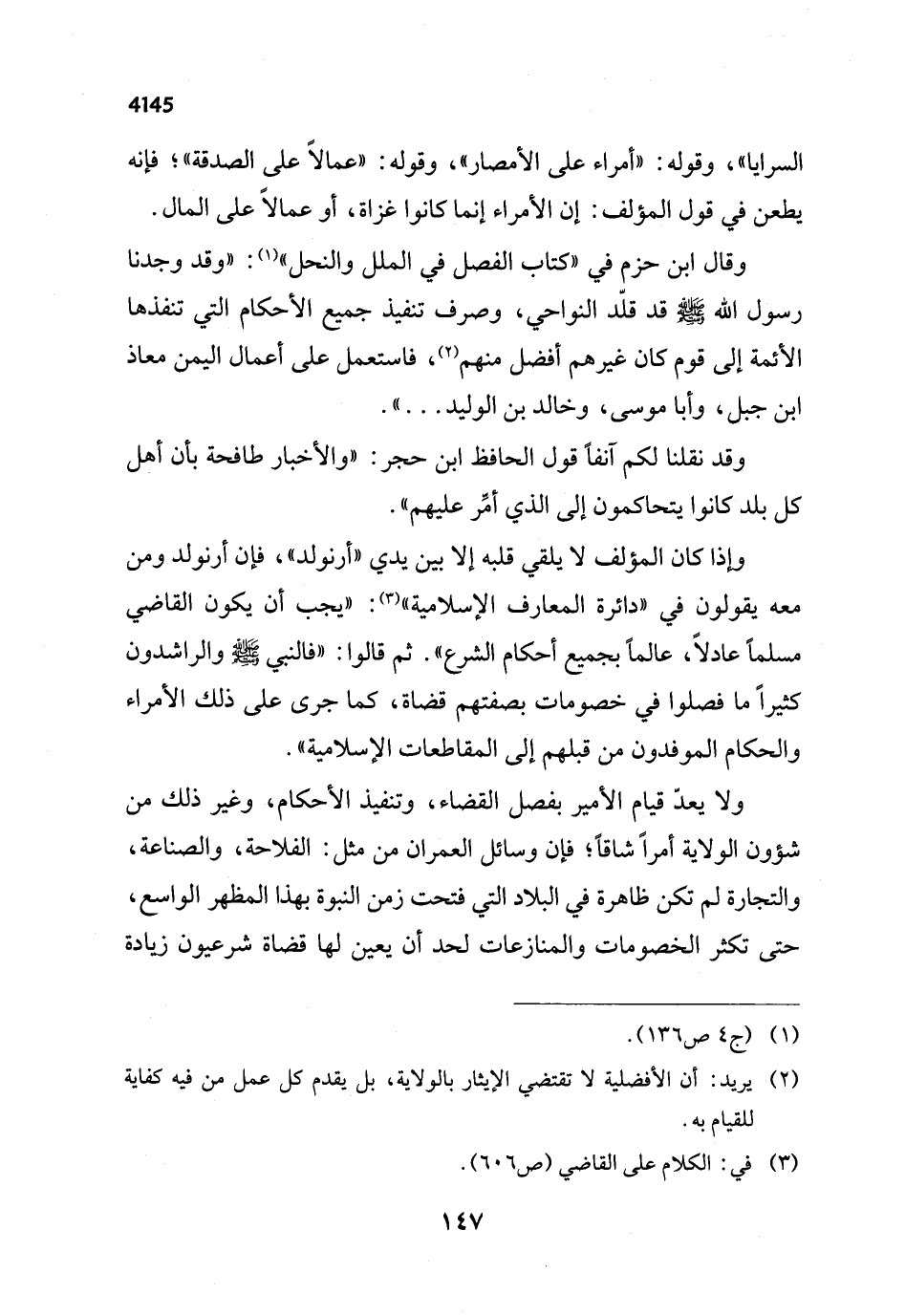 وإذا كان المؤلف لا يلقي قلبه إلا بين يدي "أرنولد"، فإن أرنولد ومن معه يقولون في "دائرة المعارف الإسلامة" (¬3): "يجب أن يكون القاضي مسلماً عادلاً، عالماً بجميع أحكام الشرع". ثم قالوا: "فالنبي - صلى الله عليه وسلم - والراشدون كثيراً ما فصلوا في خصومات بصفتهم قضاة، كما جرى على ذلك الأمراء والحكام الموفدون من قبلهم إلى المقاطعات الإسلامية".