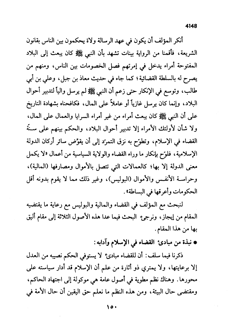 أنكر المؤلف أن يكون في عهد الرسالة ولاة يحكمون بين الناس بقانون الشريعة، فأقمنا من الرواية بينات تشهد بأن النبي - صلى الله عليه وسلم - كان يبعث إلى البلاد المفتوحة أمراء يدخل في إمرتهم فصل الخصومات بين الناس، ومنهم من يصرح له بالسلطة القضائية؛ كما جاء في حديث معاذ بن جبل، وعلي بن أبي طالب، وتوسع في الإنكار حتى زعم أن النبي - صلى الله عليه وسلم - لم يرسل والياً لتدبير أحوال البلاد، وإنما كان يرسل غازياً أو عاملاً على المال، فكافحناه بشهادة التاريخ على أن النبي - صلى الله عليه وسلم - كان يبعث أمراء من غير أمراء السرايا والعمال على المال، ولا شأن لأولئك الأمراء إلا تدبير أحوال البلاد، والحكم بينهم على سنّة القضاء في الإسلام، وتطوّح به نزق التمرّد إلى أن يقوِّض سائر أركان الدولة الإسلامية، فلوّح بإنكار ما وراء القضاء والولاية السياسية من أعمال "لا يكمل معنى الدولة إلا بها؛ كالعمالات التي تتصل بالأموال ومصارفها (المالية)، وحراسة الأنفس والأموال (البوليس)، وغير ذلك مما لا يقوم بدونه أقل الحكومات وأعرقها في البساطة".