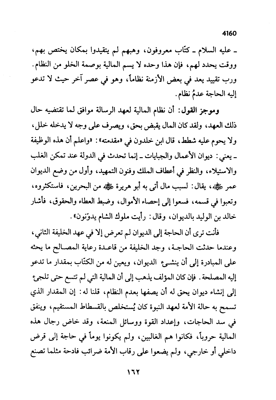 فأنت ترى أن الحاجة إلى الديوان لم تعرض إلا في عهد الخليفة الثاني، وعندما حدثت الحاجة، وجد الخليفة من قاعدة رعاية المصالح ما يحثه على المبادرة إلى أن ينشئ الديوان، ويعين له من الكتّاب بمقدار ما تدعو إليه المصلحة. فإن كان المؤلف يذهب إلى أن المالية التي لم تتسع حتى تلجئ إلى إنشاء ديوان يحق له أن يصفها بعدم النظام، قلنا له: إن المقدار الذي تسمح به حالة الأمة لعهد النبوة كان يُستخلص بالقسطاط المستقيم، وينفق في سد الحاجات، وإعداد القوة ووسائل المنعة، وقد خاض رجال هذه المالية حروباً، فكانوا هم الغالبين، ولم يكونوا يوماً في حاجة إلى قرض داخلي أو خارجي، ولم يضعوا على رقاب الأمة ضرائب فادحة مثلما تصنع