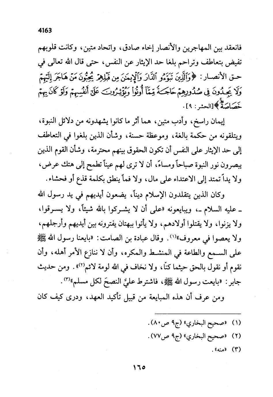 فانعقد بين المهاجرين والأنصار إخاء صادق، واتحاد متين، وكانت قلوبهم تفيض بتعاطف وتراحم بلغا حد الإيثار عن النفس، حتى قال الله تعالى في حق الأنصار: {وَالَّذِينَ تَبَوَّءُوا الدَّارَ وَالْإِيمَانَ مِنْ قَبْلِهِمْ يُحِبُّونَ مَنْ هَاجَرَ إِلَيْهِمْ وَلَا يَجِدُونَ فِي صُدُورِهِمْ حَاجَةً مِمَّا أُوتُوا وَيُؤْثِرُونَ عَلَى أَنْفُسِهِمْ وَلَوْ كَانَ بِهِمْ خَصَاصَةٌ} [الحشر: 9].
