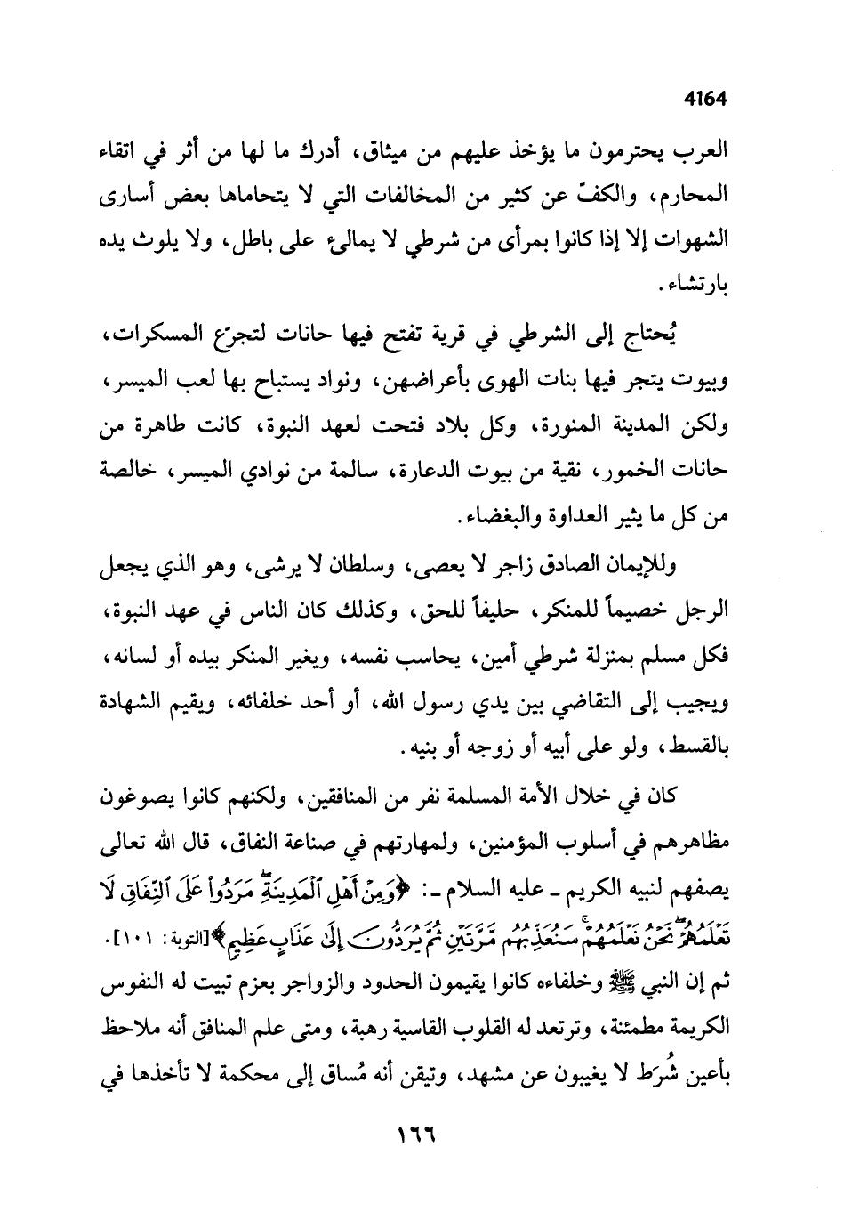 وللإيمان الصادق زاجر لا يعصى، وسلطان لا يرشى، وهو الذي يجعل الرجل خصيماً للمنكر، حليفاً للحق، وكذلك كان الناس في عهد النبوة، فكل مسلم بمنزلة شرطي أمين، يحاسب نفسه، ويغير المنكر بيده أو لسانه، ويجيب إلى التقاضي بين يدي رسول الله، أو أحد خلفائه، ويقيم الشهادة بالقسط، ولو على أبيه أو زوجه أو بنيه.