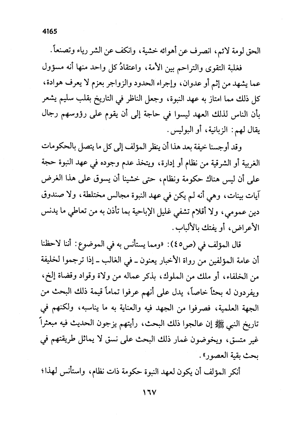 أنكر المؤلف أن يكون لعهد النبوة حكومة ذات نظام، واستأنس لهذا؛