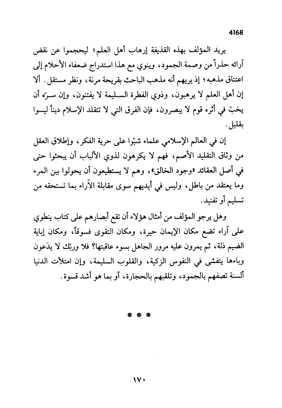 يريد المؤلف بهذه القذيفة إرهاب أهل العلم؛ ليحجموا عن نقض اَرائه حذراً من وصمة الجمود، وينوي مع هذا استدراج ضعفاء الأحلام إلى اعتناق مذهبه؛ إذ يريهم أنه مذهب الباحث بقريحة مرنة، ونظر مستقل. ألا إن أهل العلم لا يرهبون، وذوي الفطرة السليمة لا يفتنون، وإن سرّه أن يخبّ في أثره قوم لا يبصرون، فإن الفرق التي لا تتقلد الإسلام ديناً ليسوا بقليل.