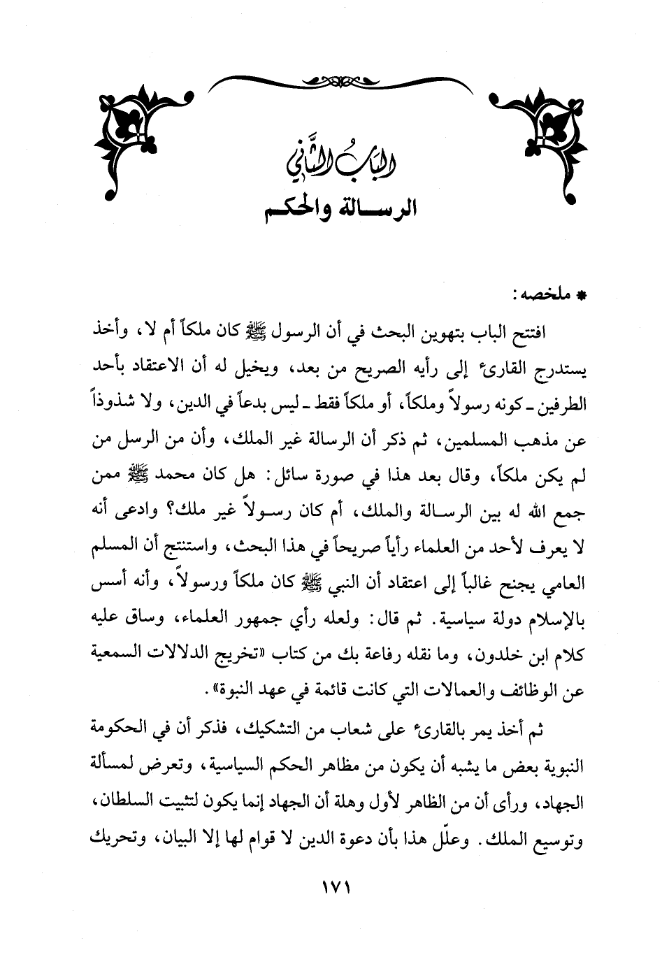 افتتح الباب بتهوين البحث في أن الرسول - صلى الله عليه وسلم - كان ملكا أم لا، وأخذ يستدرج القارئ إلى رأيه الصريح من بعد، ويخيل له أن الاعتقاد بأحد الطرفين- كونه رسولاً وملكاً، أو ملكاً فقط - ليس بدعاً في الدين، ولا شذوذاً عن مذهب المسلمين، ثم ذكر أن الرسالة غير الملك، وأن من الرسل من لم يكن ملكاً، وقال بعد هذا في صورة سائل: هل كان محمد - صلى الله عليه وسلم - ممن جمع الله له بين الرسالة والملك، أم كان رسولاً غير ملك؟ وادعى أنه لا يعرف لأحد من العلماء رأياً صريحاً في هذا البحث، واستنتج أن المسلم العامي يجنح غالباً إلى اعتقاد أن النبي - صلى الله عليه وسلم - كان ملكاً ورسولاً، وأنه أسس بالإسلام دولة سياسية. ثم قال: ولعله رأي جمهور العلماء، وساق عليه كلام ابن خلدون، وما نقله رفاعة بك من كتاب "تخريج الدلالات السمعية عن الوظائف والعمالات التي كانت قائمة في عهد النبوة".