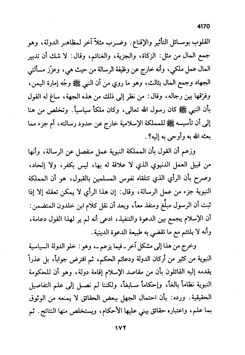 القلوب بوسائل التأثير والإقناع. وضرب مثلاً آخر لمظاهر الدولة، وهو جمع المال من مثل: الزكاة، والجزية، والغنائم، وقال: لا شك أن تدبير المال عمل ملكي، وأنه خارج عن وظيفة الرسالة من حيث هي، وعزّز مسألتي الجهاد وجمع المال بثالث، وهو ما روي من أن النبي - صلى الله عليه وسلم - وجّه إمارة اليمن، وفرّقها بين رجاله، وقال: من نظر إلى ذلك من هذه الجهة، ساغ له القول بأن النبي - صلى الله عليه وسلم - كان رسول الله تعالى، وكان ملكاً سياسياً. وتخلص من هنا إلى أن تأسيسه - صلى الله عليه وسلم - للمملكة الإسلامية خارج عن حدود رسالته، أم جزء مما بعثه الله به وأوحى به إليه؟.