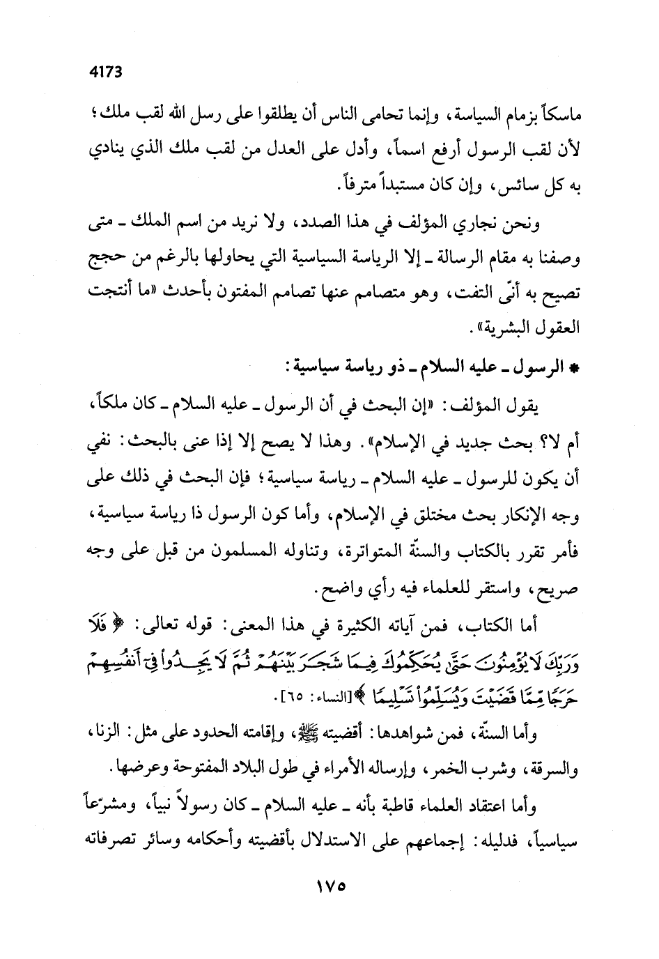 يقول المؤلف: "إن البحث في أن الرسول - عليه السلام - كان ملكاً، أم لا؟ بحث جديد في الإسلام". وهذا لا يصح إلا إذا عنى بالبحث: نفي أن يكون للرسول - عليه السلام - رياسة سياسية؛ فإن البحث في ذلك على وجه الإنكار بحث مختلق في الإسلام، وأما كون الرسول ذا رياسة سياسية، فأمر تقرر بالكتاب والسنّة المتواترة، وتناوله المسلمون من قبل على وجه صريح، واستقر للعلماء فيه رأي واضح.