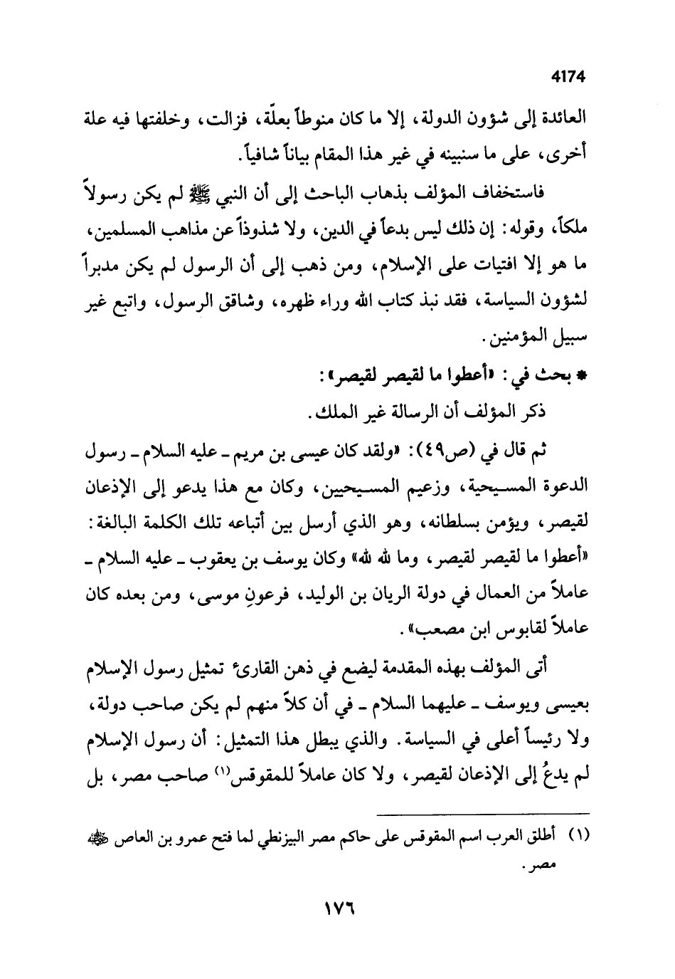 ثم قال في (ص 49): "ولقد كان عيسى بن مريم - عليه السلام - رسول الدعوة المسيحية، وزعيم المسيحيين، وكان مع هذا يدعو إلى الإذعان لقيصر، ويؤمن بسلطانه، وهو الذي أرسل بين أتباعه تلك الكلمة البالغة: "أعطوا ما لقيصر لقيصر، وما لله لله" وكان يوسف بن يعقوب - عليه السلام - عاملاً من العمال في دولة الريان بن الوليد، فرعونِ موسى، ومن بعده كان عاملاً لقابوس ابن مصعب".