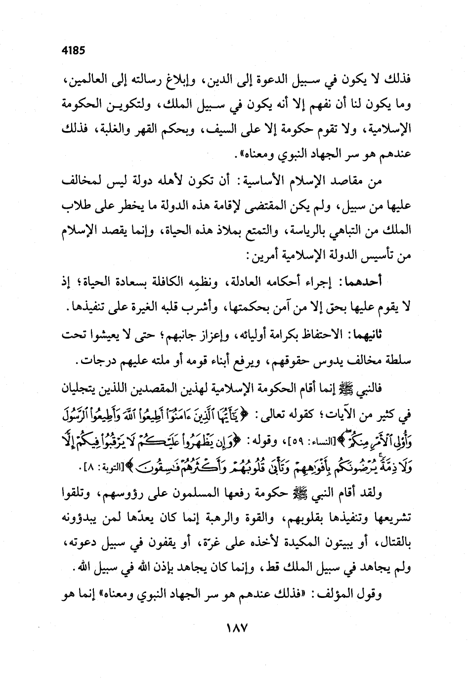 فالنبي - صلى الله عليه وسلم - إنما أقام الحكومة الإسلامية لهذين المقصدين اللذين يتجليان في كثير من الآيات؛ كقوله تعالى: {يَا أَيُّهَا الَّذِينَ آمَنُوا أَطِيعُوا اللَّهَ وَأَطِيعُوا الرَّسُولَ وَأُولِي الْأَمْرِ مِنْكُمْ} [النساء: 59]، وقوله: {وَإِنْ يَظْهَرُوا عَلَيْكُمْ لَا يَرْقُبُوا فِيكُمْ إِلًّا وَلَا ذِمَّةً يُرْضُونَكُمْ بِأَفْوَاهِهِمْ وَتَأْبَى قُلُوبُهُمْ وَأَكْثَرُهُمْ فَاسِقُونَ} [التوبة: 8].