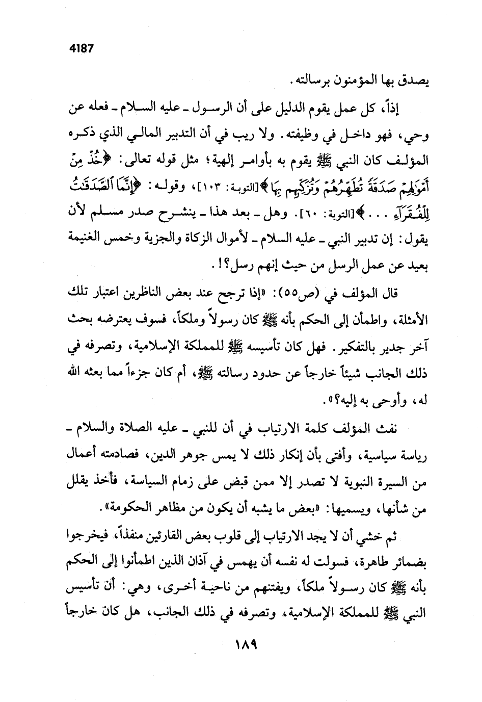 إذاً، كل عمل يقوم الدليل على أن الرسول - عليه السلام - فعله عن وحي، فهو داخل في وظيفته. ولا ريب في أن التدبير المالي الذي ذكره المؤلف كان النبي - صلى الله عليه وسلم - يقوم به بأوامر إلهية؛ مثل قوله تعالى: {خُذْ مِنْ أَمْوَالِهِمْ صَدَقَةً تُطَهِّرُهُمْ وَتُزَكِّيهِمْ بِهَا} [التوبة: 103]، وقوله: {إِنَّمَا الصَّدَقَاتُ لِلْفُقَرَاءِ ...} [التوبة: 60]. وهل -بعد هذا- ينشرح صدر مسلم لأن يقول: إن تدبير النبي - عليه السلام - لأموال الزكاة والجزية وخمس الغنيمة بعيد عن عمل الرسل من حيث إنهم رسل؟!.