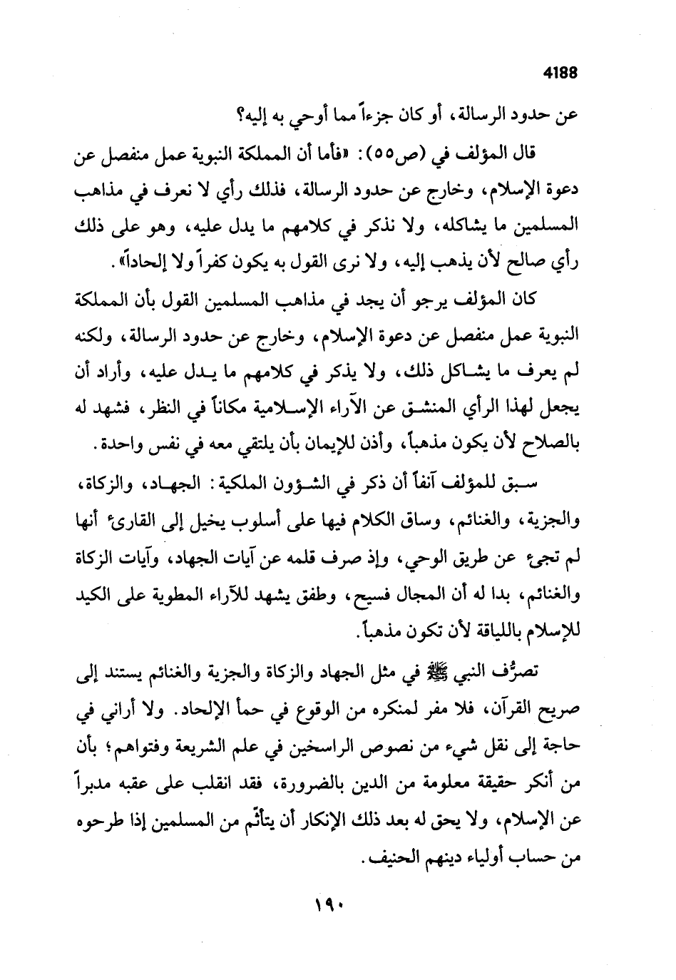 قال المؤلف في (ص 55): "فأما أن المملكة النبوية عمل منفصل عن دعوة الإسلام، وخارج عن حدود الرسالة، فذلك رأي لا نعرف في مذاهب المسلمين ما يشكله، ولا نذكر في كلامهم ما يدل عليه، وهو على ذلك رأي صالح لأن يذهب إليه، ولا نرى القول به يكون كفراً ولا إلحاداً".