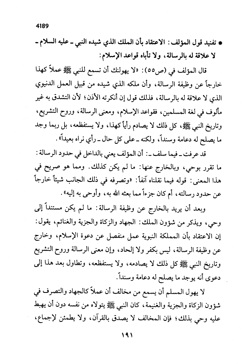 وبعد أن يريد بالخارج عن وظيفة الرسالة: ما لم يكن مستنداً إلى وحي، ويذكر من شؤون الملك: الجهاد والزكاة والجزية والغنائم، يقول: إن الاعتقاد بأن المملكة النبوية عمل منفصل عن دعوة الإسلام، وخارج عن وظيفة الرسالة، ليس بكفر ولا إلحاد، وأن معنى الرسالة وروح التشريع وتاريخ النبي - صلى الله عليه وسلم - كل ذلك لا يصادمه، ولا يستفظعه، وتطاول بعد هذا إلى دعوى أنه يوجد ما يصلح له دعامة وسنداً.