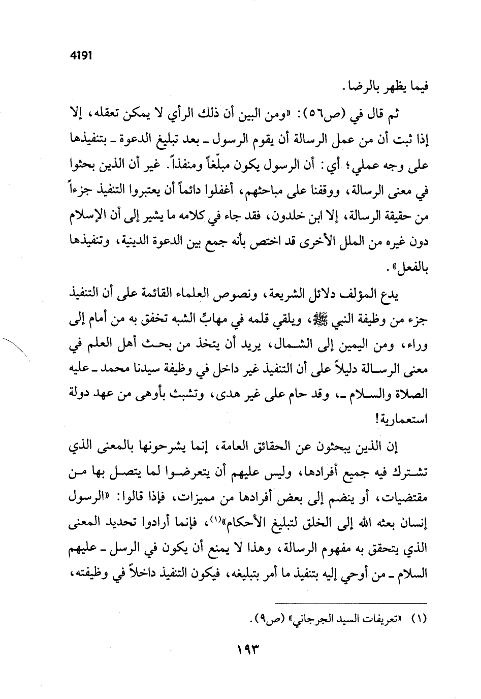 ثم قال في (ص 56): "ومن البين أن ذلك الرأي لا يمكن تعقله، إلا إذا ثبت أن من عمل الرسالة أن يقوم الرسول -بعد تبليغ الدعوة- بتنفيذها على وجه عملي؛ أي: أن الرسول يكون مبلّغاً ومنفذاً. غير أن الذين بحثوا في معنى الرسالة، ووقفنا على مباحثهم، أغفلوا دائماً أن يعتبروا التنفيذ جزءاً من حقيقة الرسالة، إلا ابن خلدون، فقد جاء في كلامه ما يشير إلى أن الإسلام دون غيره من الملل الأخرى قد اختص بأنه جمع بين الدعوة الدينية، وتنفيذها بالفعل".