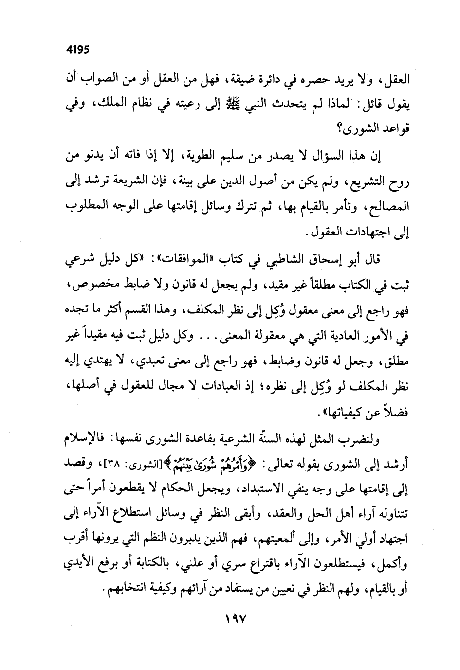 العقل، ولا يريد حصره في دائرة ضيقة، فهل من العقل أو من الصواب أن يقول قائل: لماذا لم يتحدث النبي - صلى الله عليه وسلم - إلى رعيته في نظام الملك، وفي قواعد الشورى؟