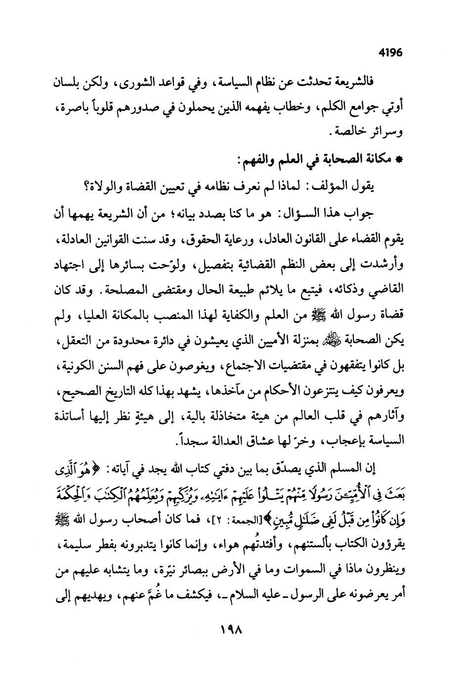 إن المسلم الذي يصدّق بما بين دفتي كتاب الله يجد في آياته: {هُوَ الَّذِي بَعَثَ فِي الْأُمِّيِّينَ رَسُولًا مِنْهُمْ يَتْلُو عَلَيْهِمْ آيَاتِهِ وَيُزَكِّيهِمْ وَيُعَلِّمُهُمُ الْكِتَابَ وَالْحِكْمَةَ وَإِنْ كَانُوا مِنْ قَبْلُ لَفِي ضَلَالٍ مُبِينٍ} [الجمعة: 2]، فما كان أصحاب رسول الله - صلى الله عليه وسلم - يقرؤون الكتاب بألستنهم، وأفئدتُهم هواء، وإنما كانوا يتدبرونه بفطر سليمة، وينظرون ماذا في السموات وما في الأرض ببصائر نيّرة، وما يتشابه عليهم من أمر يعرضونه على الرسول - صلى الله عليه وسلم - فيكشف ما غُمّ عنهم، ويهديهم إلى