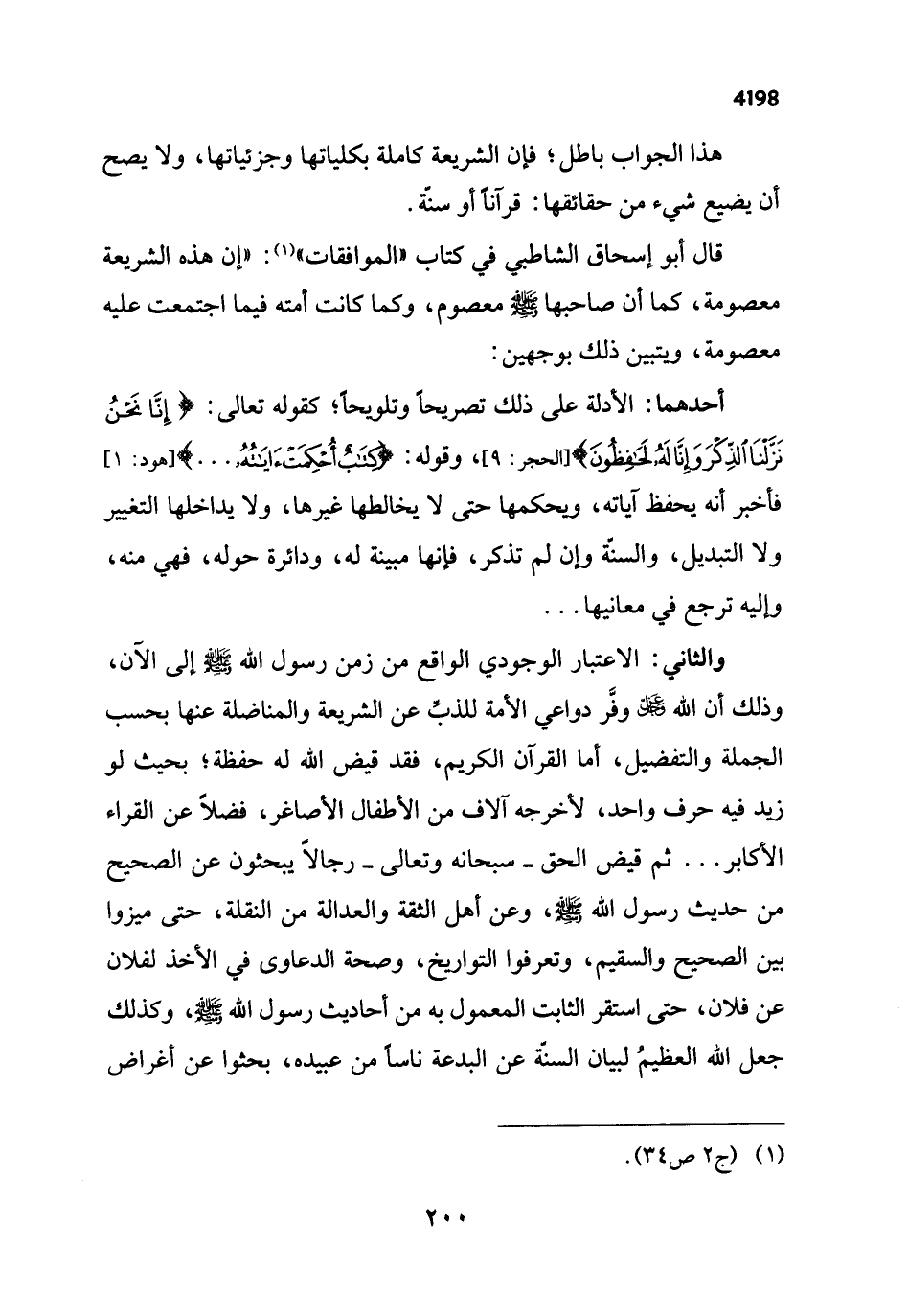 والثاني: الاعتبار الوجودي الواقع من زمن رسول الله - صلى الله عليه وسلم - إلى الآن، وذلك أن الله -عَزَّ وَجَلَّ- وفَّر دواعي الأمة للذبِّ عن الشريعة والمناضلة عنها بحسب الجملة والتفضيل، أما القرآن الكريم، فقد قيض الله له حفظة؛ بحيث لو زيد فيه حرف واحد، لأخرجه آلاف من الأطفال الأصاغر، فضلاً عن القراء الأكابر ... ثم قيض الحق -سبحانه وتعالى- رجالاً يبحثون عن الصحيح من حديث رسول الله - صلى الله عليه وسلم -، وعن أهل الثقة والعدالة من النقلة، حتى ميزوا بين الصحيح والسقيم، وتعرفوا التواريخ، وصحة الدعاوى في الأخذ لفلان عن فلان، حتى استقر الثابت المعمول به من أحاديث رسول الله - صلى الله عليه وسلم -، وكذلك جعل الله العظيمُ لبيان السنّة عن البدعة ناساً من عبيده، بحثوا عن أغراض