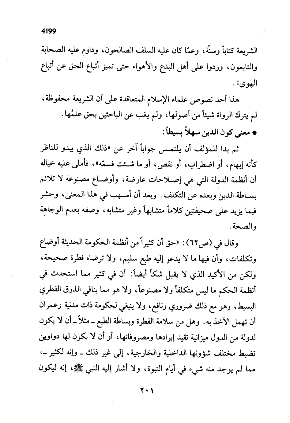 وقال في (ص 62): "حق أن كثيراً من أنظمة الحكومة الحديثة أوضاع وتكلفات، وأن فيها ما لا يدعو إليه طبع سليم، ولا ترضاه فطرة صحيحة، ولكن من الأكيد الذي لا يقبل شكاً أيضاً: أن في كثير مما استحدث في أنظمة الحكم ما ليس متكلفاً ولا مصنوعاً، ولا هو مما ينافي الذوق الفطري البسيط، وهو مع ذلك ضروري ونافع، ولا ينبغي لحكومة ذات مدنية وعمران أن تهمل الأخذ به. وهل من سلامة الفطرة وبساطة الطبع -مثلاً- أن لا يكون لدولة من الدول ميزانية تقيد إيرادها ومصروفاتها، أو أن لا يكون لها دواوين تضبط مختلف شؤونها الداخلية والخارجية، إلى غير ذلك -وإنه لكثير-، مما لم يوجد منه شيء في أيام النبوة، ولا أشار إليه النبي - صلى الله عليه وسلم -، إنه ليكون