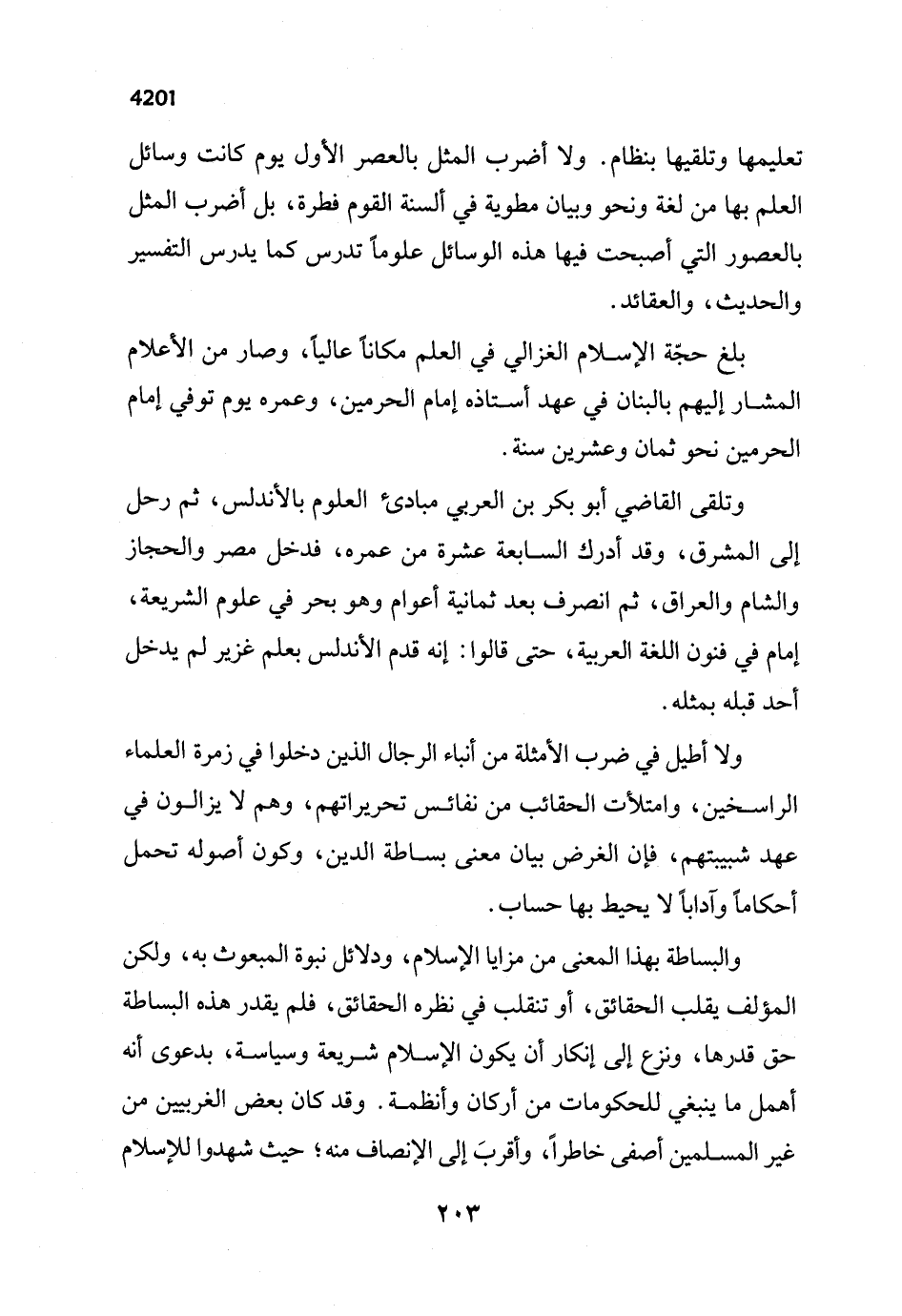 والبساطة بهذا المعنى من مزايا الإسلام، ودلائل نبوة المبعوث به، ولكن المؤلف يقلب الحقائق، أو تنقلب في نظره الحقائق، فلم يقدر هذه البساطة حق قدرها، ونزع إلى إنكار أن يكون الإسلام شريعة وسياسة، بدعوى أنه أهمل ما ينبغي للحكومات من أركان وأنظمة. وقد كان بعض الغربيين من غير المسلمين أصفى خاطراً، وأقربَ إلى الإنصاف منه؛ حيث شهدوا للإسلام