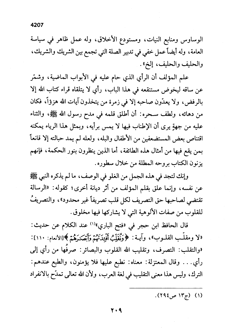 وإنك لتجد في هذه الجمل من الغلو في الوصف، ما لم يذكره النبي - صلى الله عليه وسلم - عن نفسه، وإنما علق بقلم المؤلف من أثر ديانة أخرى "كقوله: "الرسالة تقتضي لصاحبها حق التصريف لكل قلب تصريفاً غير محدود"، والتصريفُ للقلوب من صفات الألوهية التي لا يشاركها فيها مخلوق.