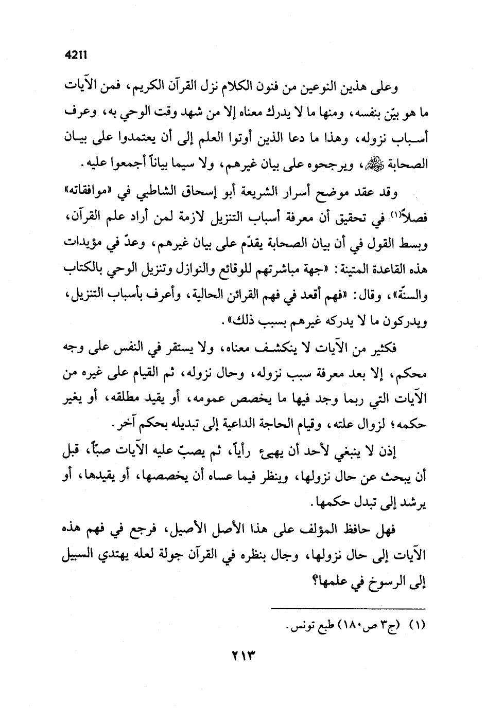 وقد عقد موضح أسرار الشريعة أبو إسحاق الشاطبي في"موافقاته" فصلاً (¬1) في تحقيق أن معرفة أسباب التنزيل لازمة لمن أراد علم القرآن، وبسط القول في أن بيان الصحابة يقدّم على بيان غيرهم، وعدّ في مؤيدات هذه القاعدة المتينة: "جهة مباشرتهم للوقائع والنوازل وتنزيل الوحي بالكتاب والسنّة"، وقال: "فهم أقعد في فهم القرائن الحالية، وأعرف بأسباب التنزيل، ويدركون ما لا يدركه غيرهم بسبب ذلك".