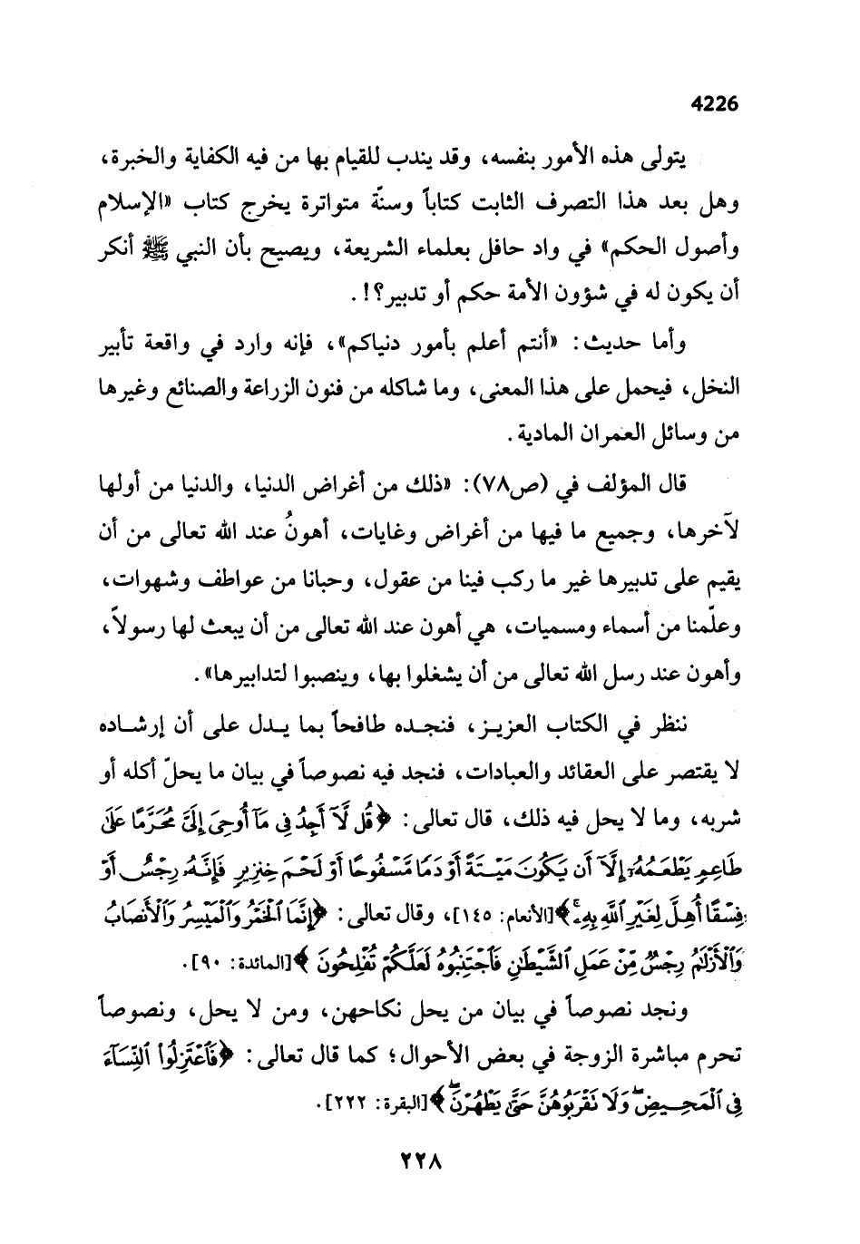 ننظر في الكتاب العزيز، فنجده طافحاً بما يدل على أن إرشاده لا يقتصر على العقائد والعبادات، فنجد فيه نصوصاً في بيان ما يحلّ أكله أو شربه، وما لا يحل فيه ذلك، قال تعالى: {قُلْ لَا أَجِدُ فِي مَا أُوحِيَ إِلَيَّ مُحَرَّمًا عَلَى طَاعِمٍ يَطْعَمُهُ إِلا أَنْ يَكُونَ مَيْتَةً أَوْ دَمًا مَسْفُوحًا أَوْ لَحْمَ خِنْزِيرٍ فَإِنَّهُ رِجْسٌ أَوْ فِسْقًا أُهِلَّ لِغَيْرِ اللَّهِ بِهِ} [الأنعام: 145]، وقال تعالى: {إِنَّمَا الْخَمْرُ وَالْمَيْسِرُ وَالْأَنْصَابُ وَالْأَزْلَامُ رِجْسٌ مِنْ عَمَلِ الشَّيْطَانِ فَاجْتَنِبُوهُ لَعَلَّكُمْ تُفْلِحُونَ} [المائدة: 90].