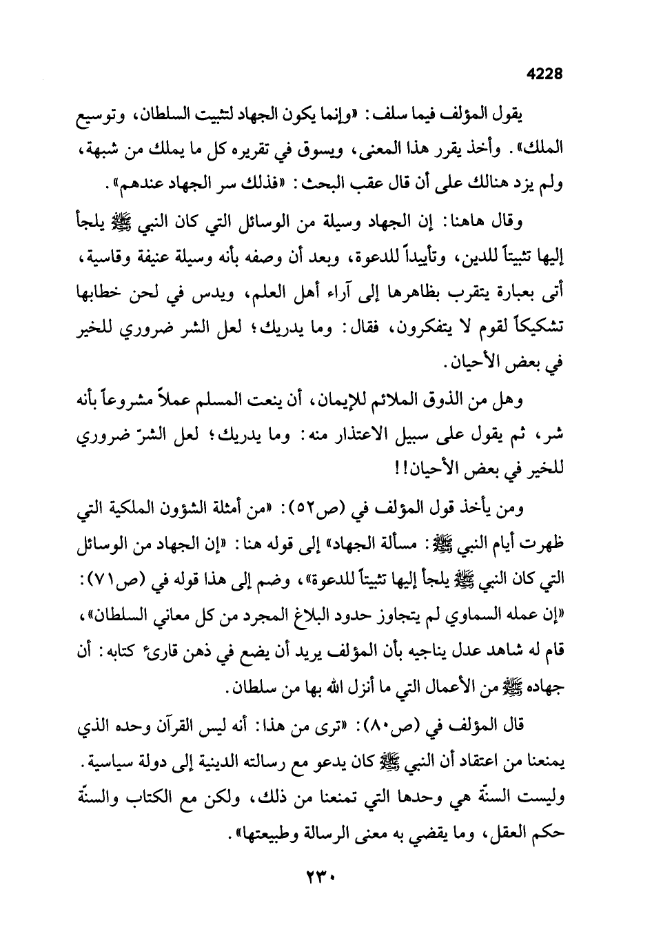 ومن يأخذ قول المؤلف في (ص 52): "من أمثلة الشؤون الملكية التي ظهرت أيام النبي - صلى الله عليه وسلم -: مسألة الجهاد" إلى قوله هنا: "إن الجهاد من الوسائل التي كان النبي - صلى الله عليه وسلم - يلجأ إليها تثبيتاً للدعوة"، وضم إلى هذا قوله في (ص 71): "إن عمله السماوي لم يتجاوز حدود البلاع المجرد من كل معاني السلطان"، قام له شاهد عدل يناجيه بأن المؤلف يريد أن يضع في ذهن قارئ كتابه: أن جهاده - صلى الله عليه وسلم - من الأعمال التي ما أنزل الله بها من سلطان.