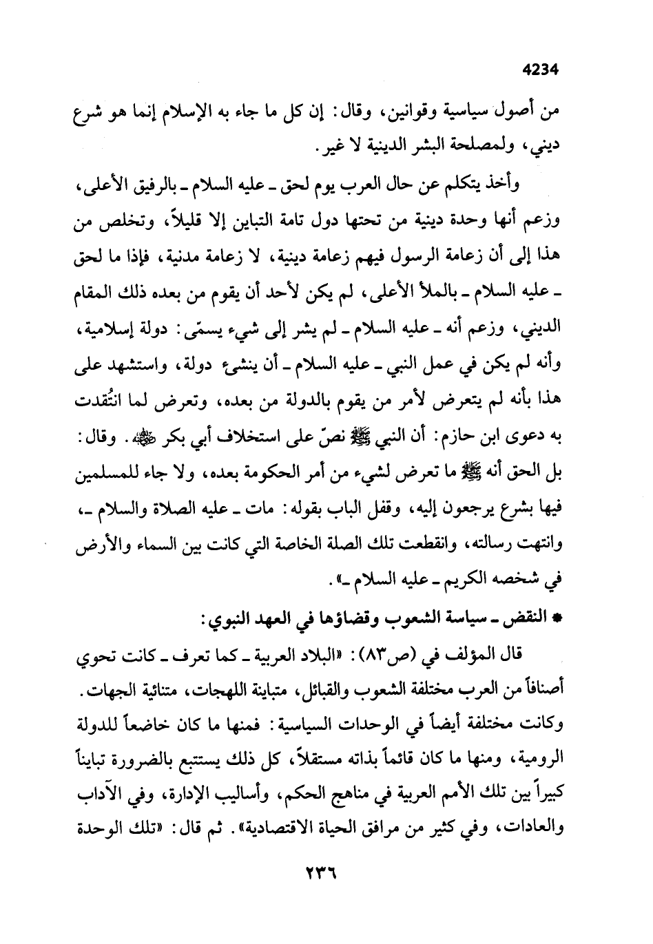 وأخذ يتكلم عن حال العرب يوم لحق - عليه السلام - بالرفيق الأعلى، وزعم أنها وحدة دينية من تحتها دول تامة التباين إلا قليلاً، وتخلص من هذا إلى أن زعامة الرسول فيهم زعامة دينية، لا زعامة مدنية، فإذا ما لحق - عليه السلام - بالملأ الأعلى، لم يكن لأحد أن يقوم من بعده ذلك المقام الديني، وزعم أنه - عليه السلام - لم يشر إلى شيء يسمّى: دولة إسلامية، وأنه لم يكن في عمل النبي - عليه السلام - أن ينشئ دولة، واستشهد على هذا بأنه لم يتعرض لأمر من يقوم بالدولة من بعده، وتعرض لما انتُقدت به دعوى ابن حازم: أن النيي - صلى الله عليه وسلم - نصّ على استخلاف أبي بكر - رضي الله عنه -. وقال: بل الحق أنه - صلى الله عليه وسلم - ما تعرض لشيء من أمر الحكومة بعده، ولا جاء للمسلمين فيها بشرع يرجعون إليه، وقفل الباب بقوله: مات - عليه الصلاة والسلام -, وانتهت رسالته، وانقطعت تلك الصلة الخاصة التي كانت يين السماء والأرض في شخصه الكريم - عليه السلام - ".