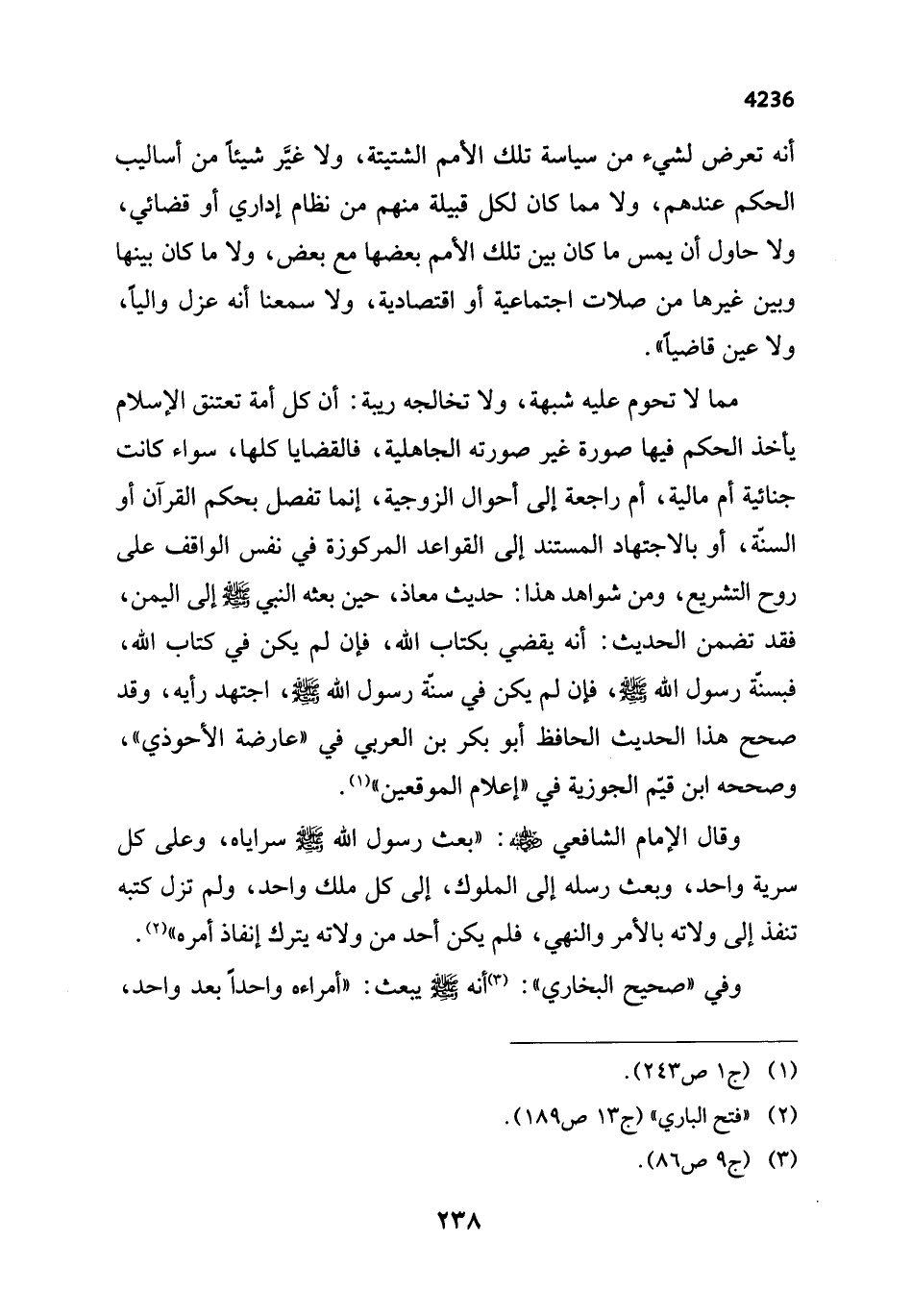 مما لا تحوم عليه شبهة، ولا تخالجه ريبة: أن كل أمة تعتنق الإسلام يأخذ الحكم فيها صورة غير صورته الجاهلية، فالقضايا كلها، سواء كانت جنائية أم مالية، أم راجعة إلى أحوال الزوجية، إنما تفصل بحكم القرآن أو السنّة، أو بالاجتهاد المستند إلى القواعد المركوزة في نفس الواقف على روح التشريع، ومن شواهد هذا: حديث معاذ، حين بعثه النبي - صلى الله عليه وسلم - إلى اليمن، فقد تضمن الحديث: أنه يقضي بكتاب الله، فإن لم يكن في كتاب الله، فبسنّة رسول الله - صلى الله عليه وسلم -، فإن لم يكن في سنّة رسول الله - صلى الله عليه وسلم -، اجتهد رأيه، وقد صحح هذا الحديث الحافظ أبو بكر بن العربي في "عارضة الأحوذي"، وصححه ابن قيّم الجوزية في "إعلام الموقعين" (¬1).